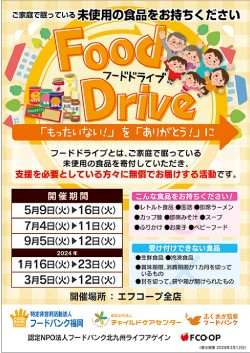 お知らせ お知らせ 総合TOP お知らせ 店舗情報 エフコープ全店舗で「フードドライブ」を開催します 店舗情報 2023年07月31日 エフコープ全店舗で「フードドライブ」を開催します 「フードドライブ」とは各家庭で使いきれない未使用の食品を持ち寄り、フードバンク団体などに寄贈する活動です。「もったいない!」を「ありがとう!」に。みなさんのご協力をお願いいたします。 受付期間 9月5日(火)~12日(火) 場所 エフコープ全店舗 回収方法:各店舗に設置している専用のボックスへ下記の商品をお持ちください。 賞味期限が1カ月以上あるもの 未使用・未開封のもの 常温保存が可能なもの ※医薬品・アルコール類は対象外 前の記事へ 次の記事へ 一覧へ戻る 年度 すべて すべて 2025年度 2024年度 2023年度 2022年度 2021年度 2020年度 2019年度 2018年度 カテゴリ すべて すべて 公告 お知らせ 募集 店舗情報 施設情報 西日本豪雨支援 九州北部豪雨支援 熊本地震支援 プレスリリース 情報をおさがしですか?