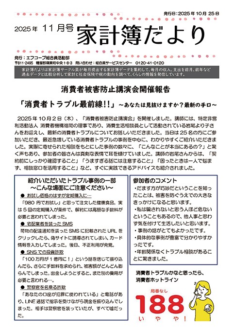 お知らせ お知らせ 総合TOP お知らせ お知らせ 家計簿だより11月号を発行しました お知らせ 2025年11月18日 家計簿だより11月号を発行しました 「家計簿だより」は、家計簿サークル員がつける「生協の家計簿」の毎月の集計や分析などを掲載しています。「家計簿だより」を通してくらしの情報を発信します。 家計簿だよりバックナンバーはこちら 前の記事へ 次の記事へ 一覧へ戻る 年度 すべて すべて 2025年度 2024年度 2023年度 2022年度 2021年度 2020年度 2019年度 2018年度 カテゴリ すべて すべて 公告 お知らせ 募集 店舗情報 施設情報 西日本豪雨支援 九州北部豪雨支援 熊本地震支援 プレスリリース 情報をおさがしですか?