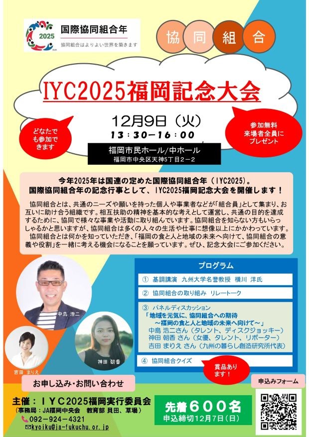 今年2025年は国連が定める「国際協同組合年(IYC)」。その記念イベントを福岡市民ホールで開催します!協同組合の魅力を知り、地域の未来を一緒に考えませんか?