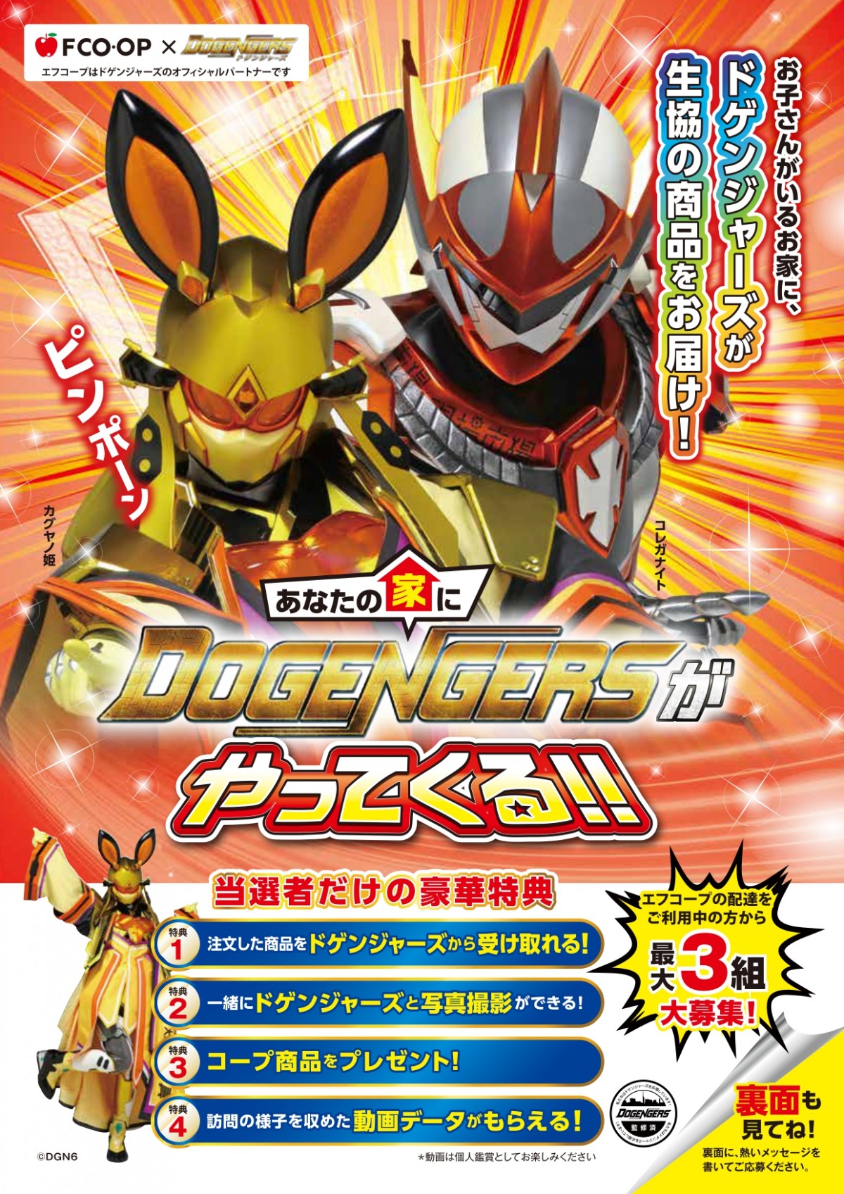 コープの配達をご利用中の組合員を対象に、夢企画「あなたの家にドゲンジャーズがやってくる!」を実施します。当選されたご家庭には、ドゲンジャーズがご自宅を訪問。最大3組限定の特別企画です。たくさんのご応募をお待ちしています。