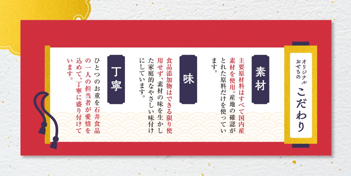 エフコープの「オリジナルおせち」は組合員さんによる„おせち委員会"が利用者アンケートをもとに製造元の石井食品と、毎年一緒に作り上げています。今年もすべての主要原材料を国内産にこだわり、九州各地の食材も取り入れました。また、食品添加物はできるだけ使用せず、素材本来のおいしさを生かしたシンプルで家庭的なやさしい味付けに仕上げています。
