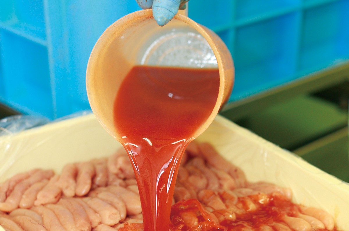 旨みの染みたマイルドな味と自然な色合いで「食べやすくておいしい」と好評の『CO・OP&鮮鼓堂パクッと食べられる辛子明太子』。その原料は冬~春にかけてとれるロシア産スケトウダラの卵巣。漁獲後、船内ですぐさま加工・選別されすばやく凍結。工場で解凍し、洗浄・異物除去~2段階の漬け込みなど、いくつもの工程を経て出荷されます。