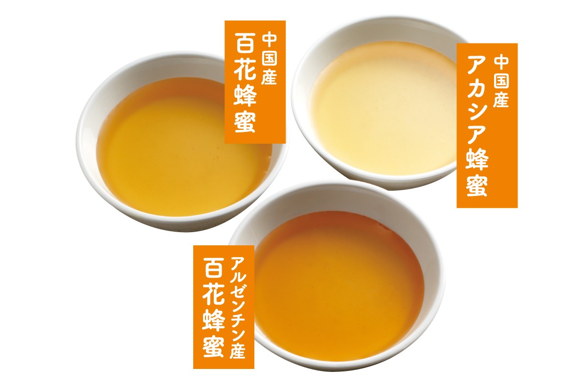 原料は、中国産のアカシア蜂蜜と中国産百花蜂蜜、アルゼンチン産の百花蜂蜜。産地からサンプルを取り寄せ、味・香りともに納得のいくものだけを入荷しています。
