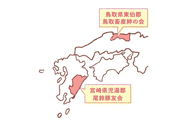 『産直豚のプレスハム』の原料は、宮崎県の「尾鈴豚友会」と鳥取県の「鳥取畜産絆の会」が育てたエフコープの産直豚です。