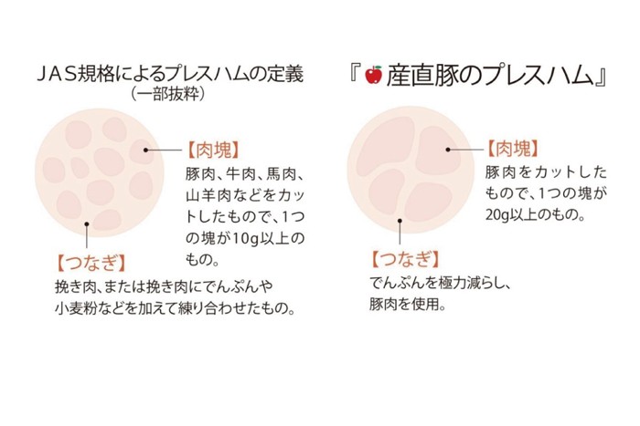 『産直豚のプレスハム』は、名前のとおり産直豚を100%使用したエフコープのプライベートブランド商品です。製造を行うのは、福岡県豊前市にある「みやこハム」。初代の『ファミリープレス』が誕生した1987年当時はハムといえば添加物の使用が主流の中、着色料や発色剤不使用の「無塩せき製法」を採用。1987年の発売以降、リニューアルを重ね変わらない味と製法で愛され続けるロングセラーのハムです。