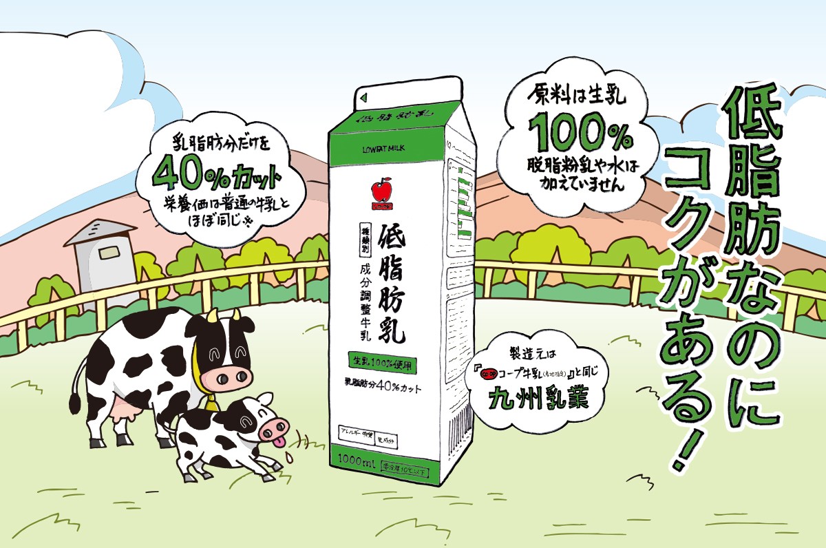 商品について Pickup! 今週のおすすめ 総合TOP 商品について Pickup! 今週のおすすめ 低脂肪乳 2025年12月15日 生乳100%、乳脂肪分40%カット 低脂肪乳 脂質はカット、栄養価は「コープ牛乳(産地指定)」とほぼ同じ! エフコープのプライベートブランド商品『低脂肪乳』。脱脂粉乳など余分なものは加えず、生乳を100%使用。乳脂肪分だけを40%カットした「成分調整牛乳」で栄養価は普通の牛乳とほとんど変わりません。「生乳の味がしっかりしていておいしい」「飲み比べても、普通の牛乳と間違えてしまうほどコクがある」と評判で、愛され続けている『低脂肪乳』をぜひ一度お試しください。 商品についてもっと詳しく見る 前の記事へ 次の記事へ 一覧へ戻る 年度 すべて すべて 2025年度 2024年度 2023年度 2022年度 情報をおさがしですか?