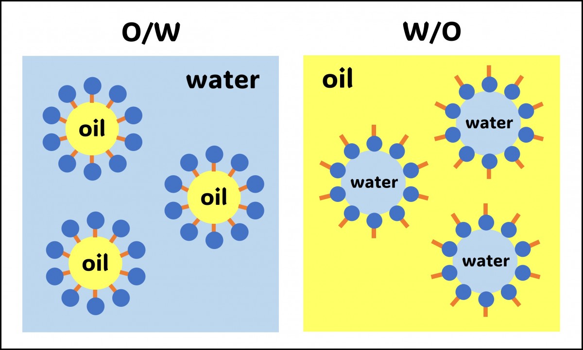 乳化には、水の中に油が混ざる「水中油型(O/W)」と、油の中に水が混ざる「油中水型(W/O)」があり、