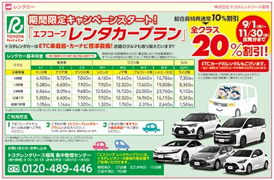トヨタレンタリース各店舗に直接ご予約ください。ご予約の際、「エフコープ レンタカープラン」とお伝えください(お申し出がない場合は通常料金となります)。ご来店の際に組合員証をご提示ください。