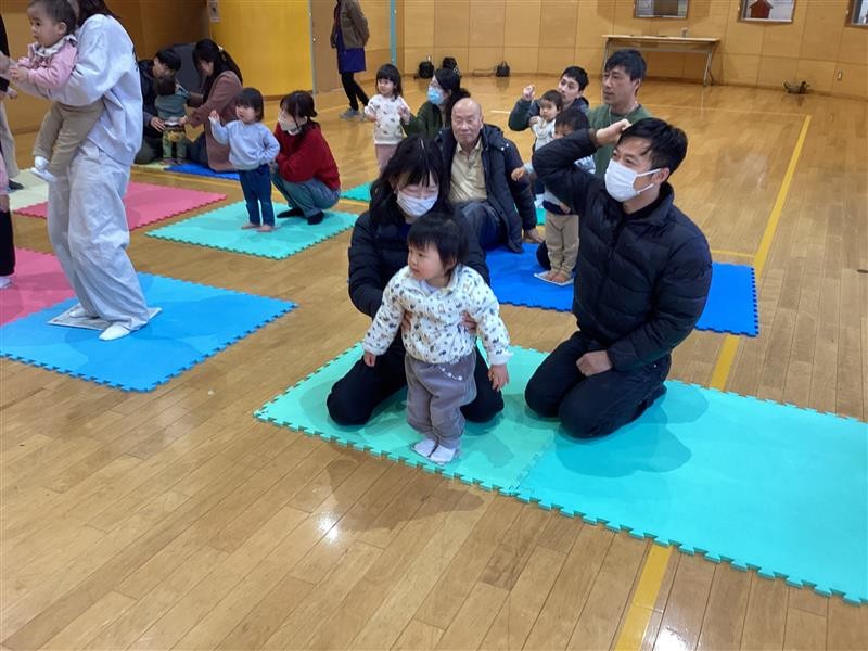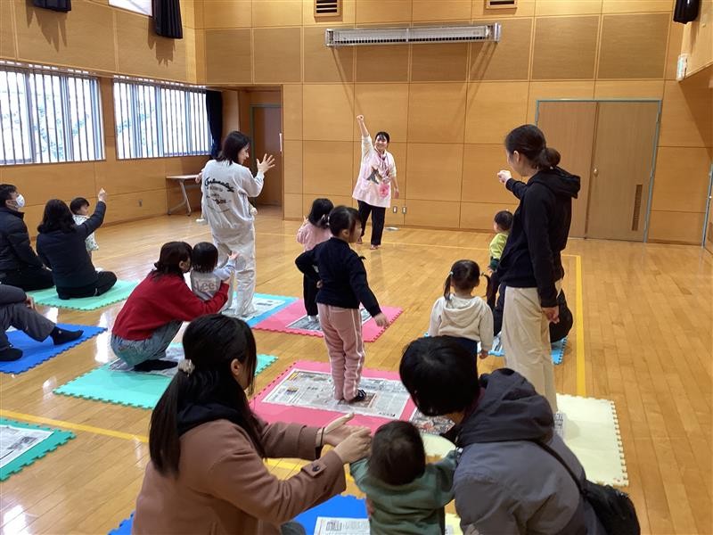 新聞じゃんけんでは、負けるとだんだんと小さくなる新聞の上で、片足で立ったり保護者に抱っこされたり、バランスを取っている姿が可愛らしかったです♡勝っても負けても笑顔で楽しそうでした。