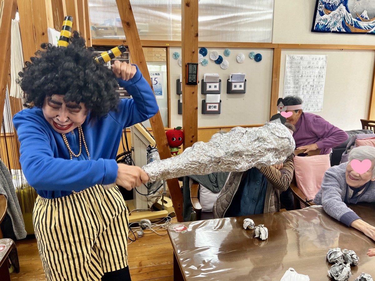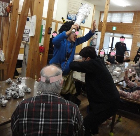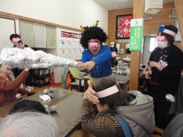 新聞紙を丸めて作った豆で鬼退治!! まぁ…皆さん元気のいいこと💦