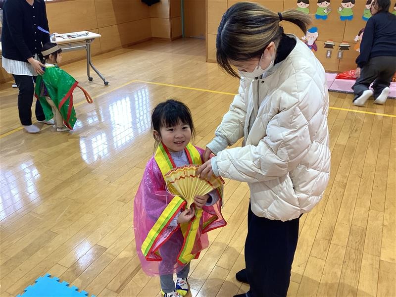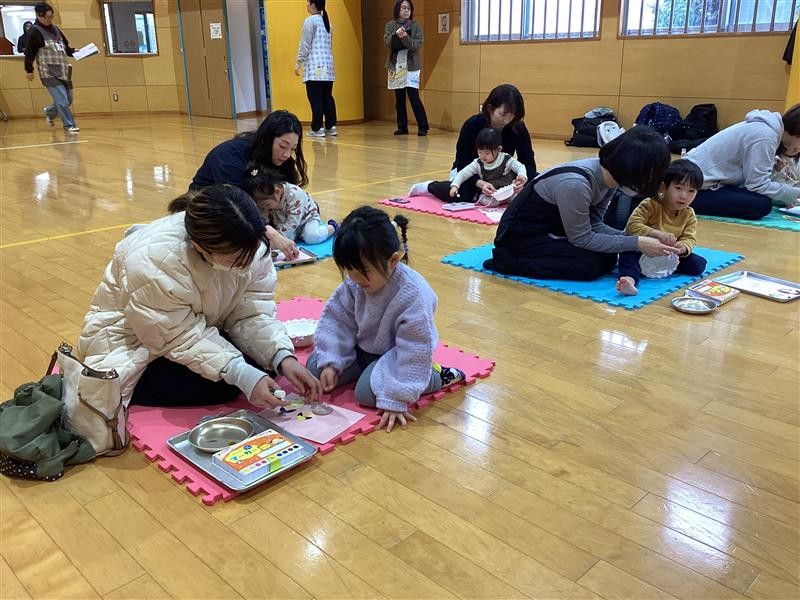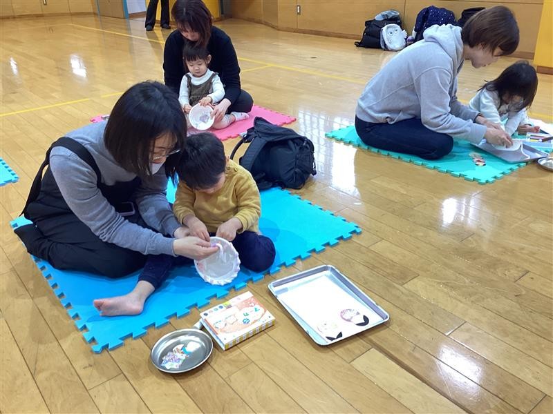 今回はのり貼り、紐通し等にチャレンジしてもらいました。保護者の方に手伝ってもらったり、教えてもらったり…