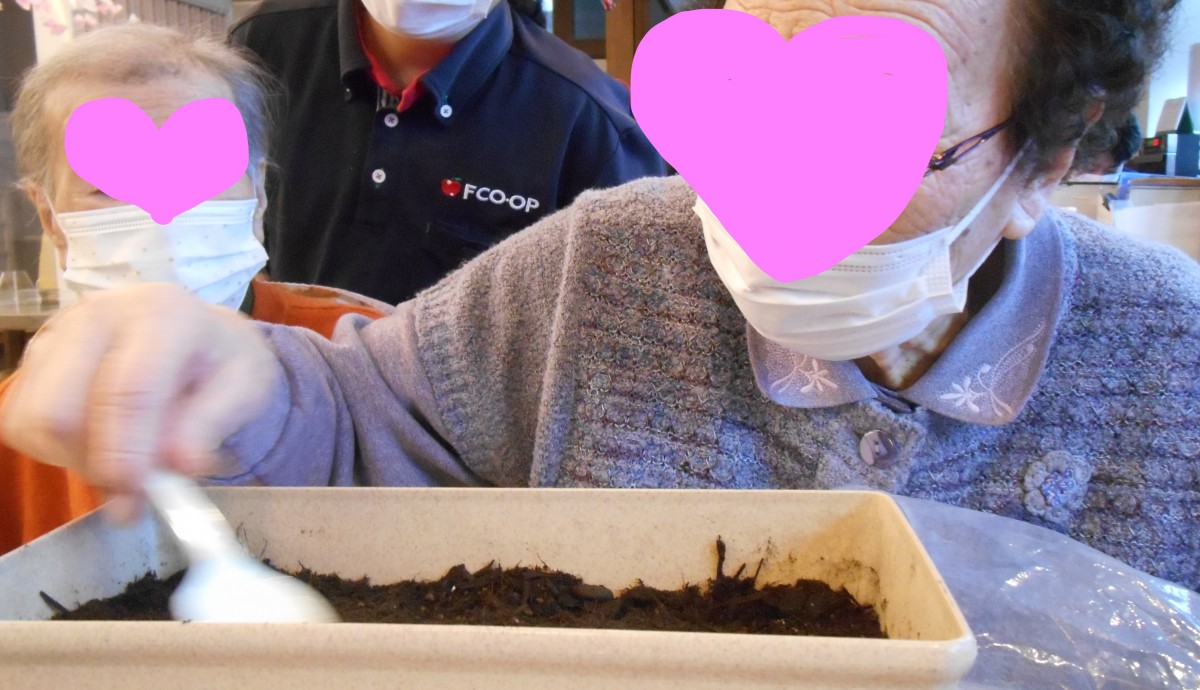 かがやき春日では、プランターに新しく土と肥料をいれ、種まきをしました。