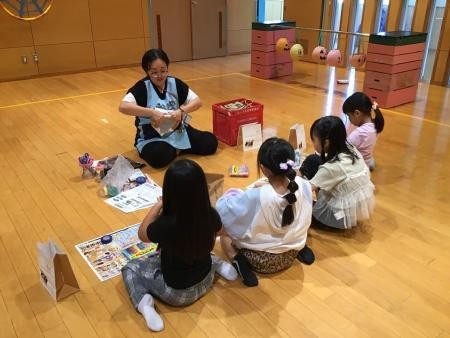 令和6年10月13日(日)みんなで工作「作ってあそぼう」を開催しました。10月はハロウィンの季節だったので、作ったハロウィンマントを着用し、みんなであそびました!紙袋フリスビーを使っておばけ退治。チラシボールを投げたら蜘蛛の巣にひっついたり、空気砲で的あてしたり、ピニャータたちもフリスビーをあてて、ゆらゆら…(今回は割らずにあててゆらゆら楽しみました)。思いきり楽しみました。途中、暑くなったのでマントは片付けてからあそんでいましたよ。