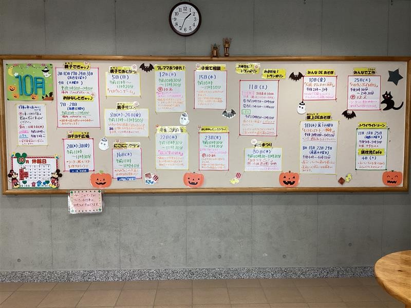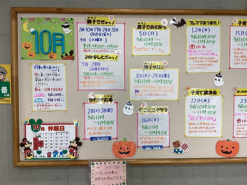 10月の須玖児童センターでは講師をお招きしてのイベント『プレママ・プレパパ』や『子育て講演会』をはじめ、おまつりごっこの『あきまつり』、ハロウィンに関する行事などいろいろと予定しています!!ぜひ参加してみてくださいね。