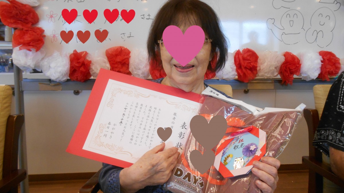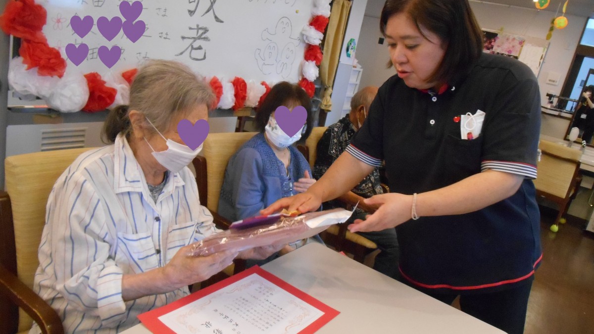 かがやきからは賞状と敬老の日の壁飾りを、本部からブランケットを全員に贈呈しました。