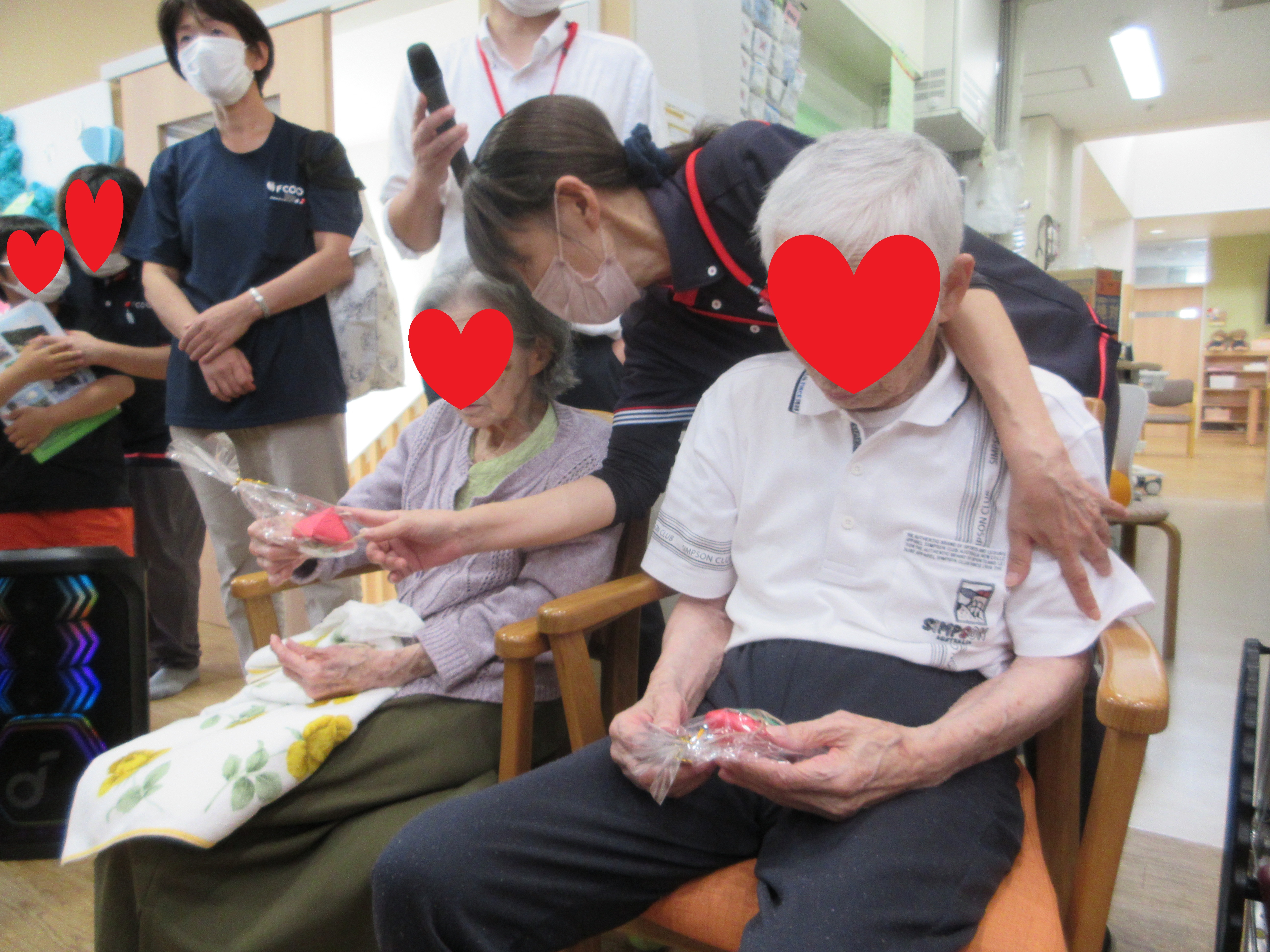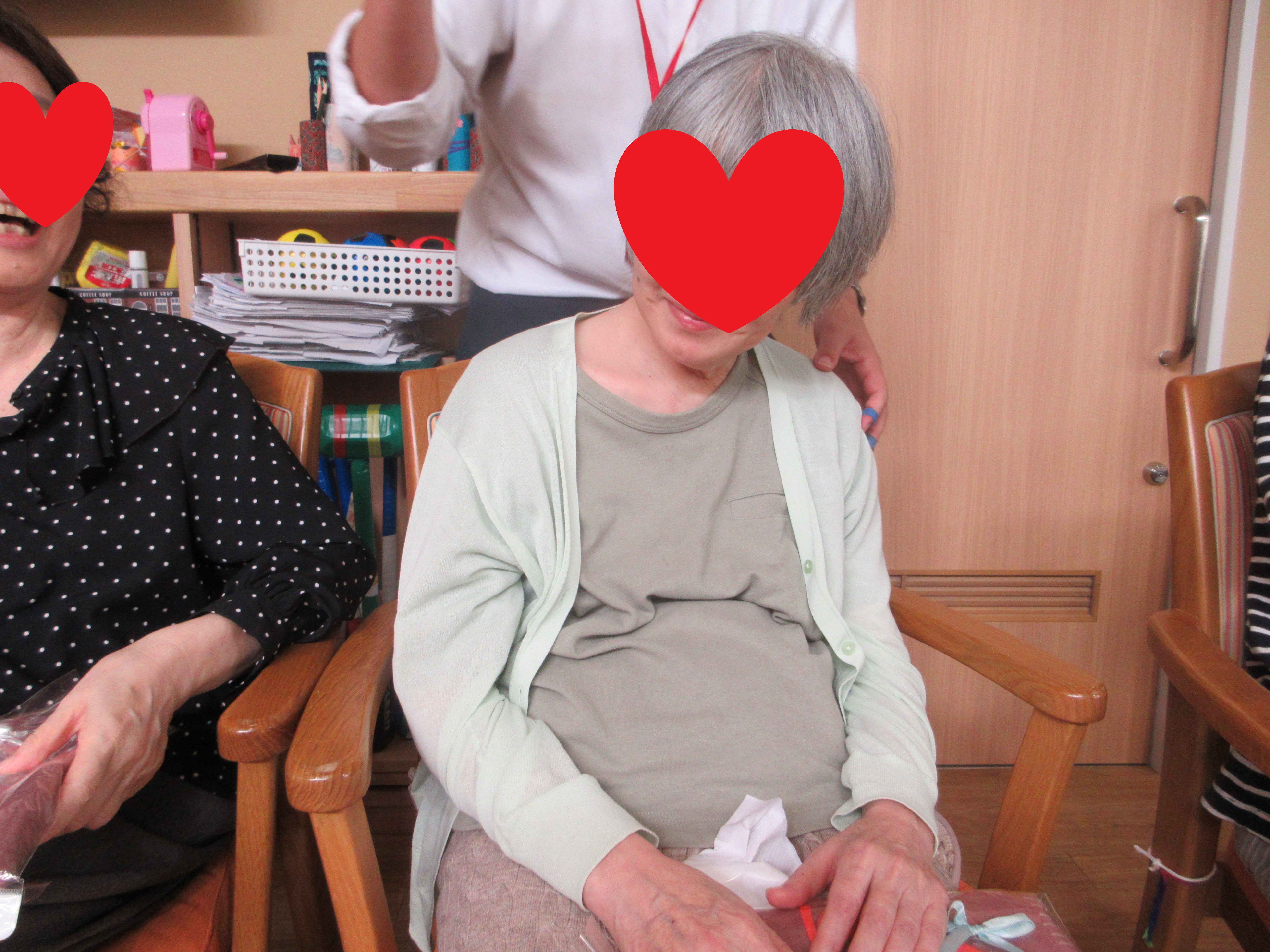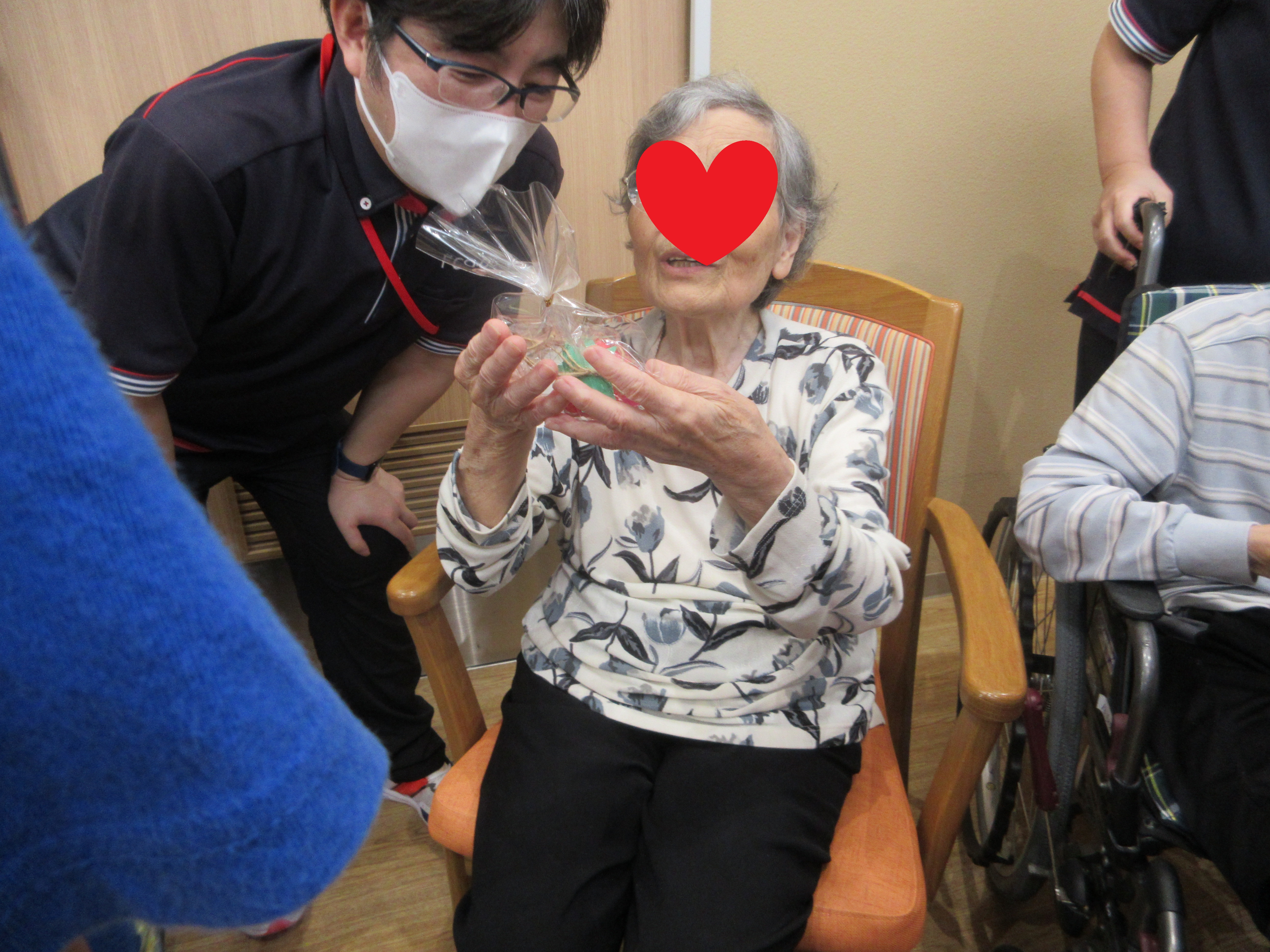 ご利用者のみなさんは、かわいらしい贈り物を手に取りながら「うれしいね!」「上手に作ってあるね!」