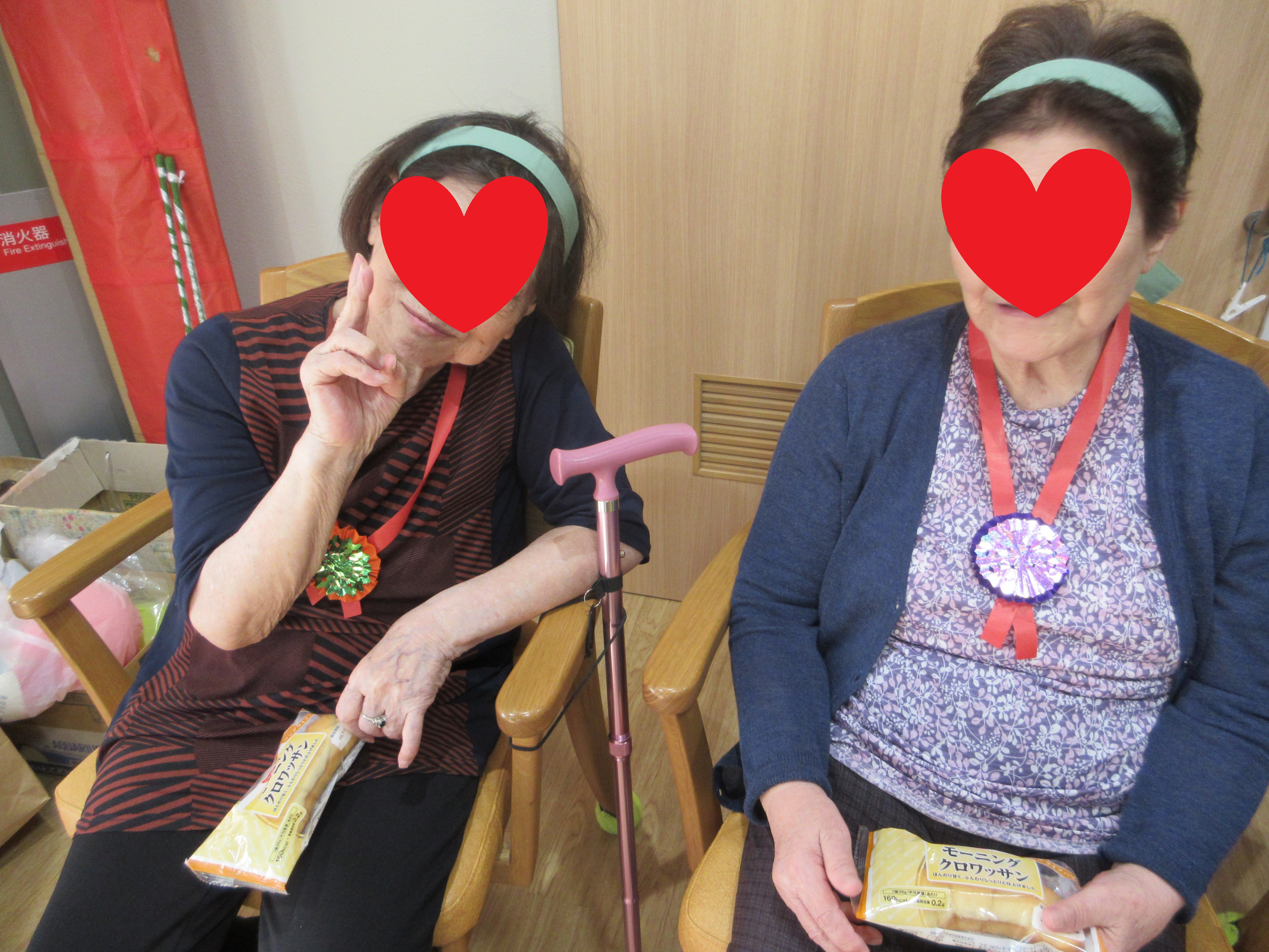 ぶら下がったパンを前に、ご利用者の皆さんは真剣な表情!