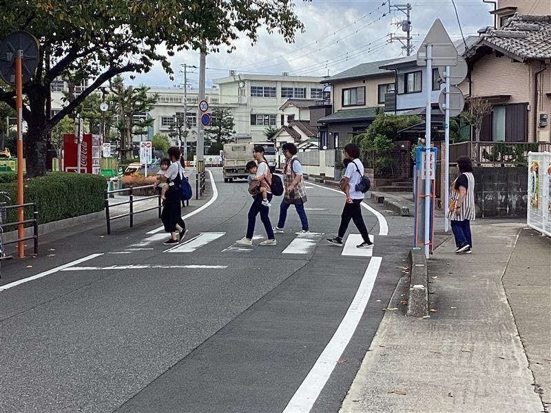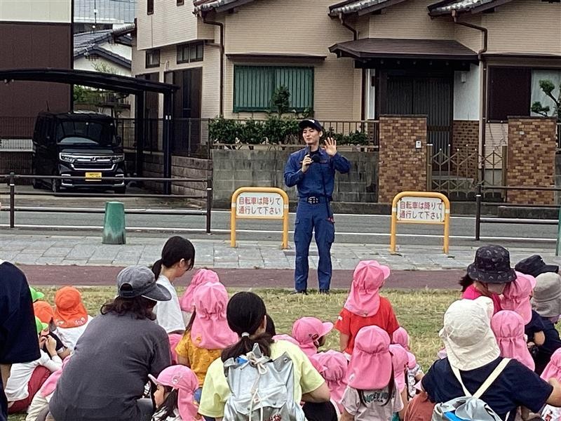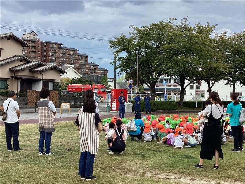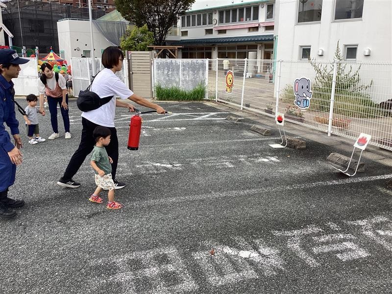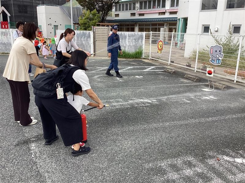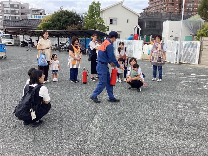 保育所からの出火を想定し、放送指示に従って来館者と一緒に親水公園まで避難しました。避難後は消防署の方からお話があり、避難する際に気をつけることを教わりました。消防車が須玖保育所駐車場にきていたので、消防車と一緒に記念撮影をすることもできました。その後、消火器の使い方を教えてもらい水消火器を使って消火訓練も親子で体験しましたよ。