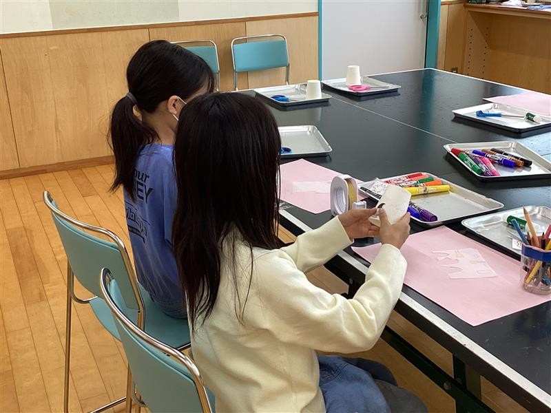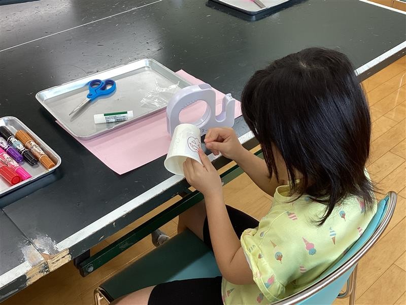 好きな絵を描いて貼り付けたり、暗闇boxに作品をいれて状態を確認したりしながら個性豊かなランタンを作成していました。