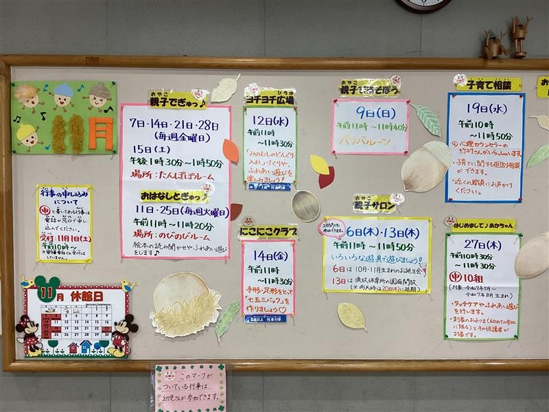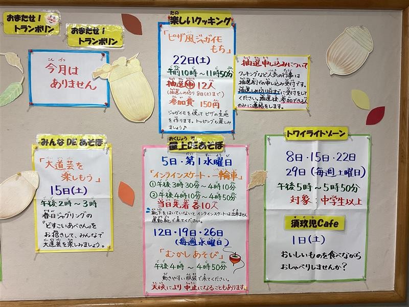 11月の須玖児童センターでは、大道芸をみんなで楽しんだり、保育園の園庭で遊んだりする行事を予定しています。詳しくはホームページやおたよりを見てぜひ参加してみてください。