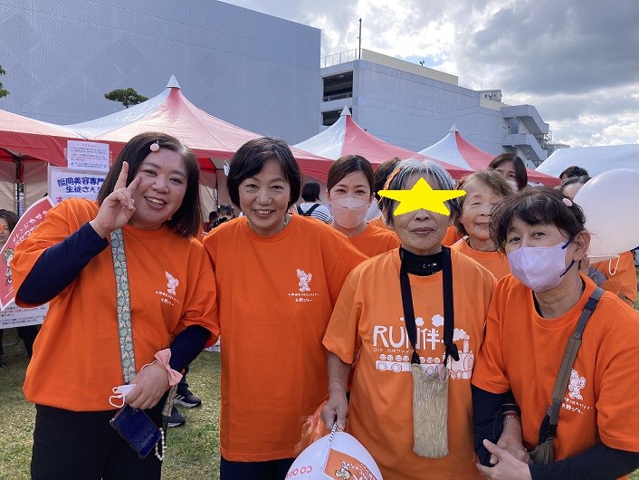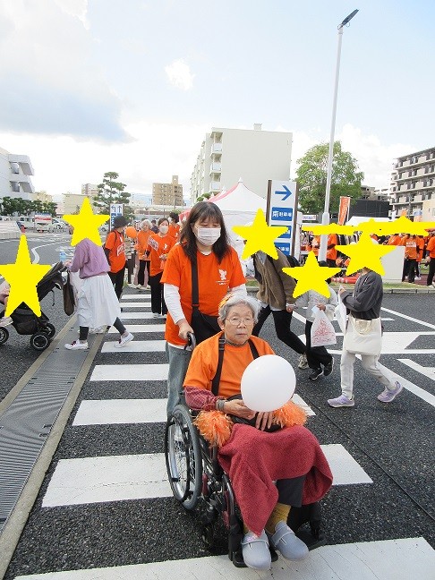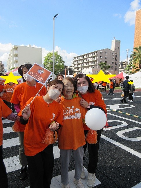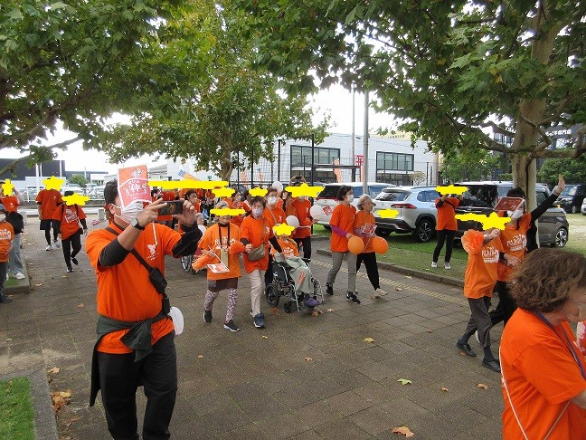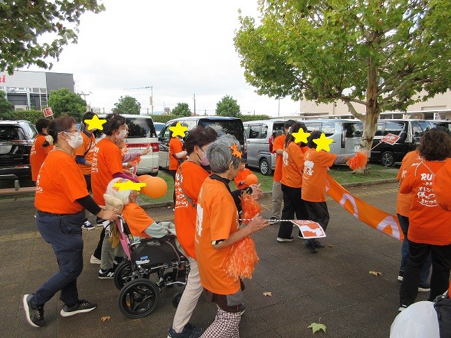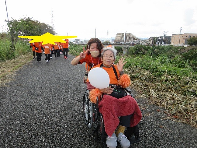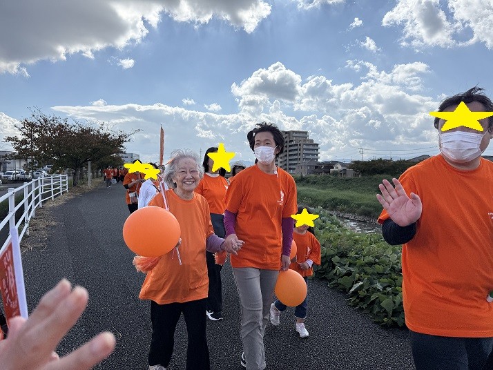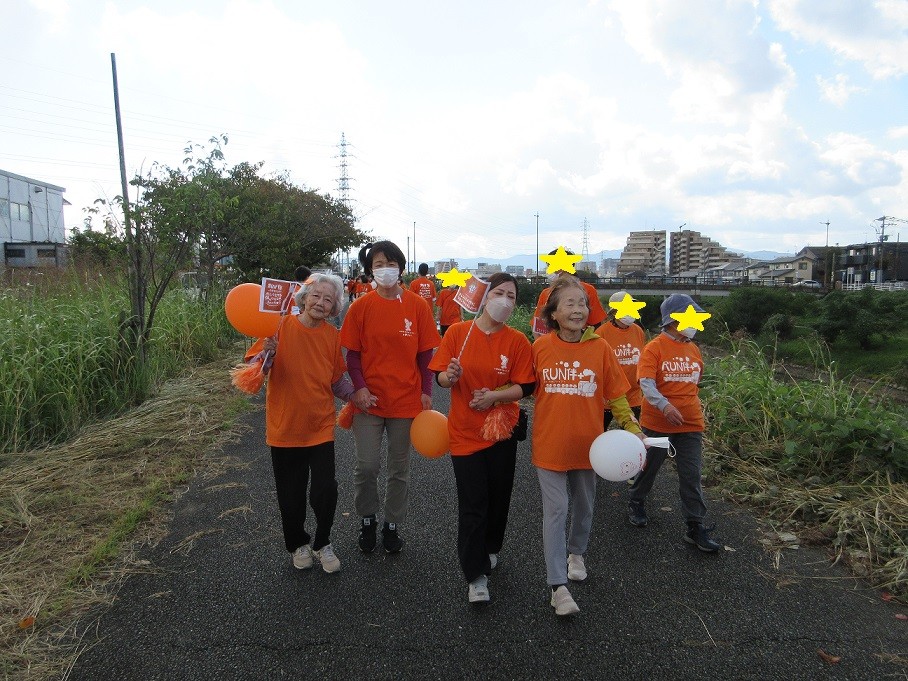 私たち、かがやき大野城からもシンボルカラーのオレンジ色のTシャツを着て、5名の利用者様と共に大野城市役所から御笠川沿いを通り北コミュニティセンターへ向かいました😊