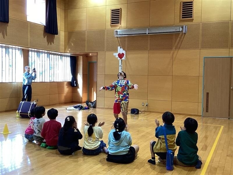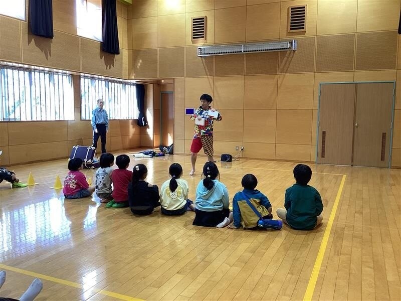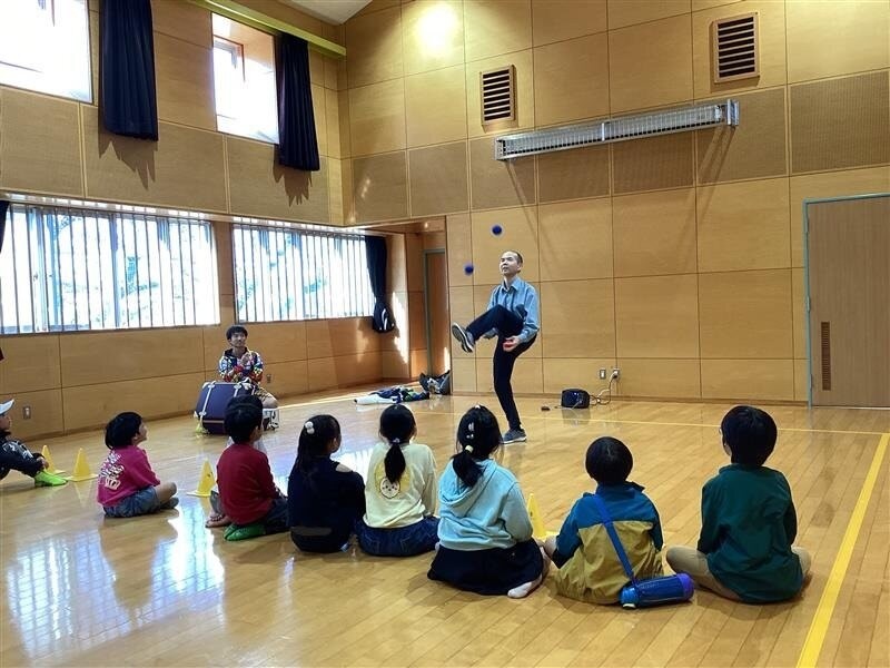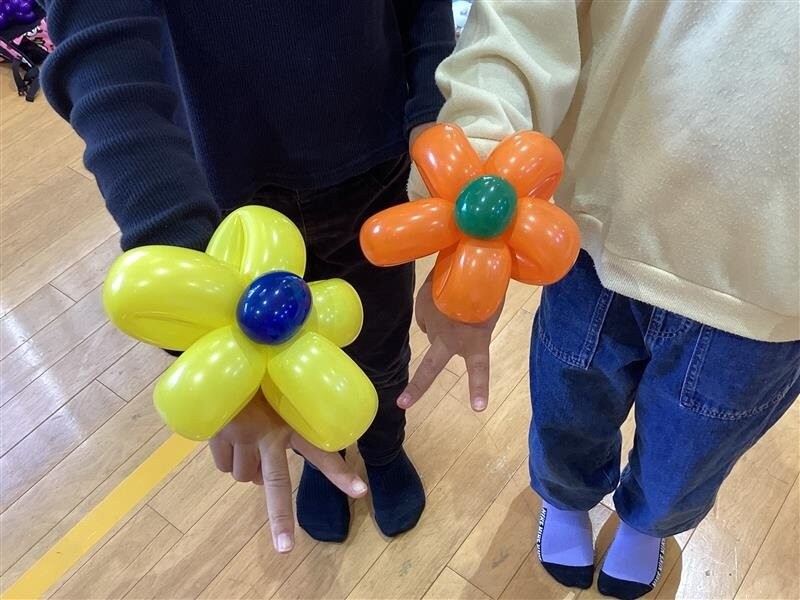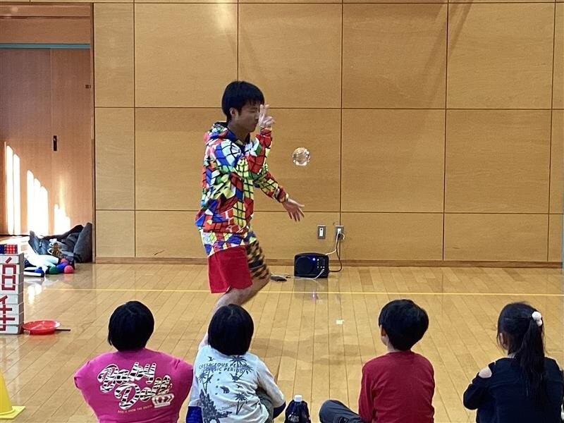 今回『春日ジャグリングクラブ』から2名の方にお越し頂きました。14:00~15:00の間でいろいろなパフォーマンスをしてもらったり、バルーンを作ってもらったりしました。道具にも触らせてもらえる機会もありましたよ。こどもたちは、ジャグリングのやり方などを教えてもらい何度も挑戦していました。皿回しも回せるようになると嬉しそうでした。普段触ることができないものもあり、貴重な体験ができました。
