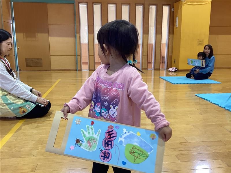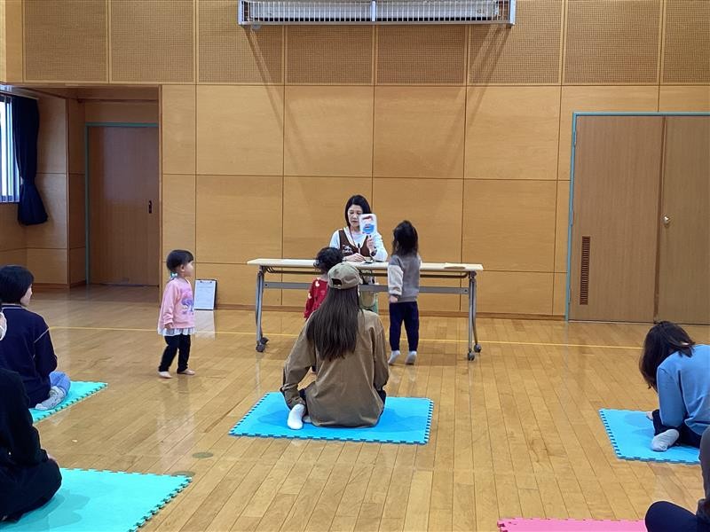 まずは七五三の由来についてクイズ形式のペープサートをしました。こどもたちはペープサートの絵を前まで見に来てくれ、こちらからの質問に元気よく答えてくれていました。中には七五三のお祝いをすませたばかりのお友達もいましたよ!少し難しいことばも出てきましたが参加した保護者の方達は頷きながら聞いてくれていました。