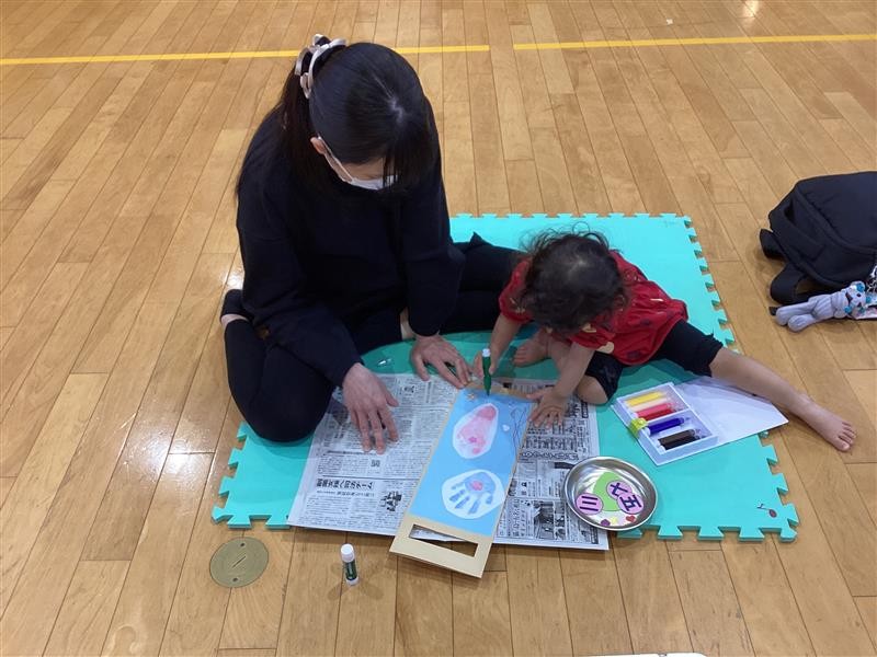手形、足形を取ったらバックに貼り付け少し手を加えたら長寿の象徴「鶴と亀」に変身!こどもたちはおしゃべりも忘れるくらいお絵描きやのり付けに集中していましたよ♪ニコニコくらぶ終了の挨拶をすると、こどもたちは自分が作ったオリジナルバッグを職員に見せに来てくれタッチしてくれました!みんなが健康ですくすく成長しますように。