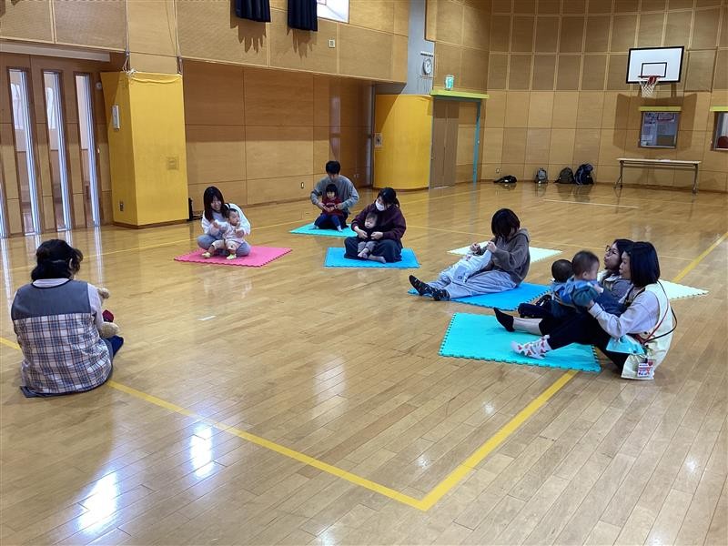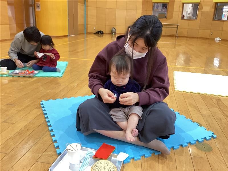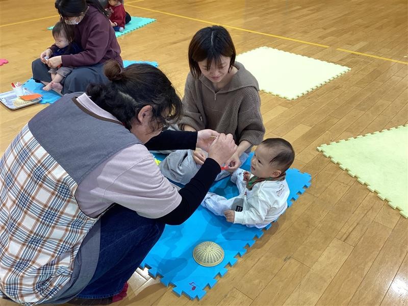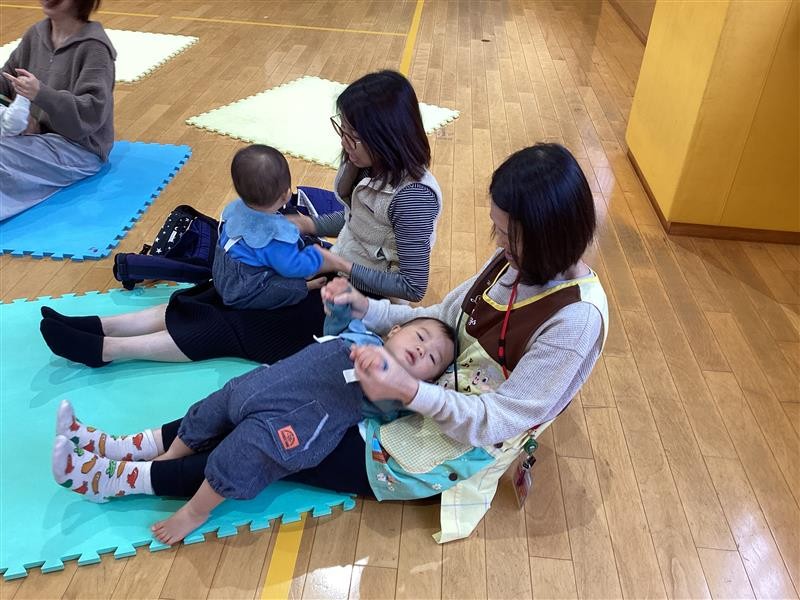 ふれあい遊びでは、ママやパパのお膝に乗ってぴょんぴょん跳ねたり、抱っこや手をつないでリズムに合わせて動いてみたり…。笑顔で楽しんでくれました。