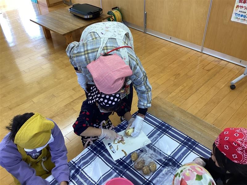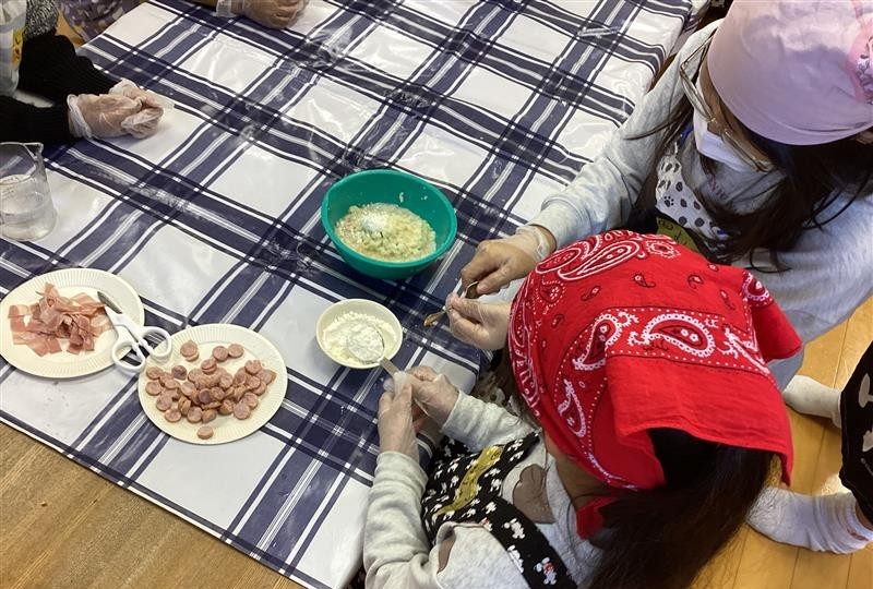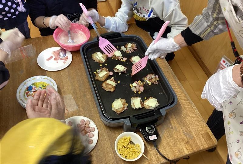 今回はすりおろしたじゃがいもを生地にし、ベーコン・ウインナー・コーン・チーズをトッピング!ピザ風のじゃがいもモチを作りました。じゃがいもの皮をむくのに少し苦戦しましたが、みんなで協力しすりおろしまで上手に行うことができました。すりおろした小麦粉と水を加えてホットプレートに流し込みました。丸い形に整えて焼くと、とってもいい匂いがして「アツアツが食べたーい」という声が上がっていましたよ♪