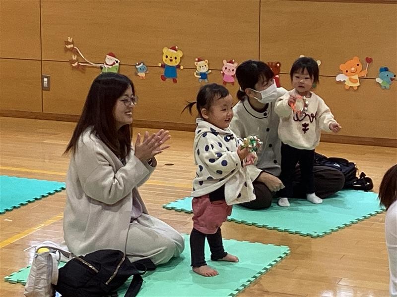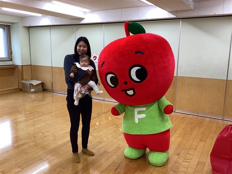 クリスマスの曲に合わせてタンバリンや鈴を鳴らして楽器あそびを楽しみました。他にもクリスマスに関するうた2曲を流し、リズムに合わせてシャンシャン♪リンリン♪クリスマスの雰囲気をみんなで味わいましたよ。遊んだあとは、サンタさんの代わりにエフコープのキャラクター『エフりん』がこどもたちのプレゼントを届けにきてくれました。プレゼントをもらって嬉しそうな笑顔が見られました。