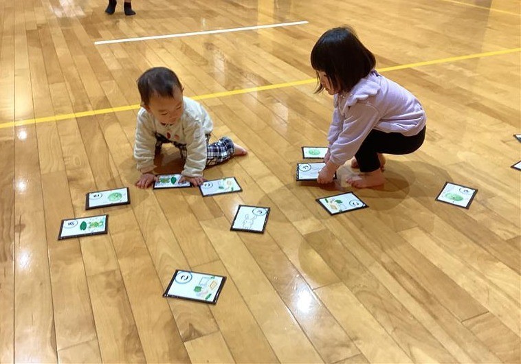 新年最初の行事!!体を温めるためにかるたの運動遊びをみんなで行いました。言われた絵札を見つけて走ってゴール!!上手にみつけることができていました。