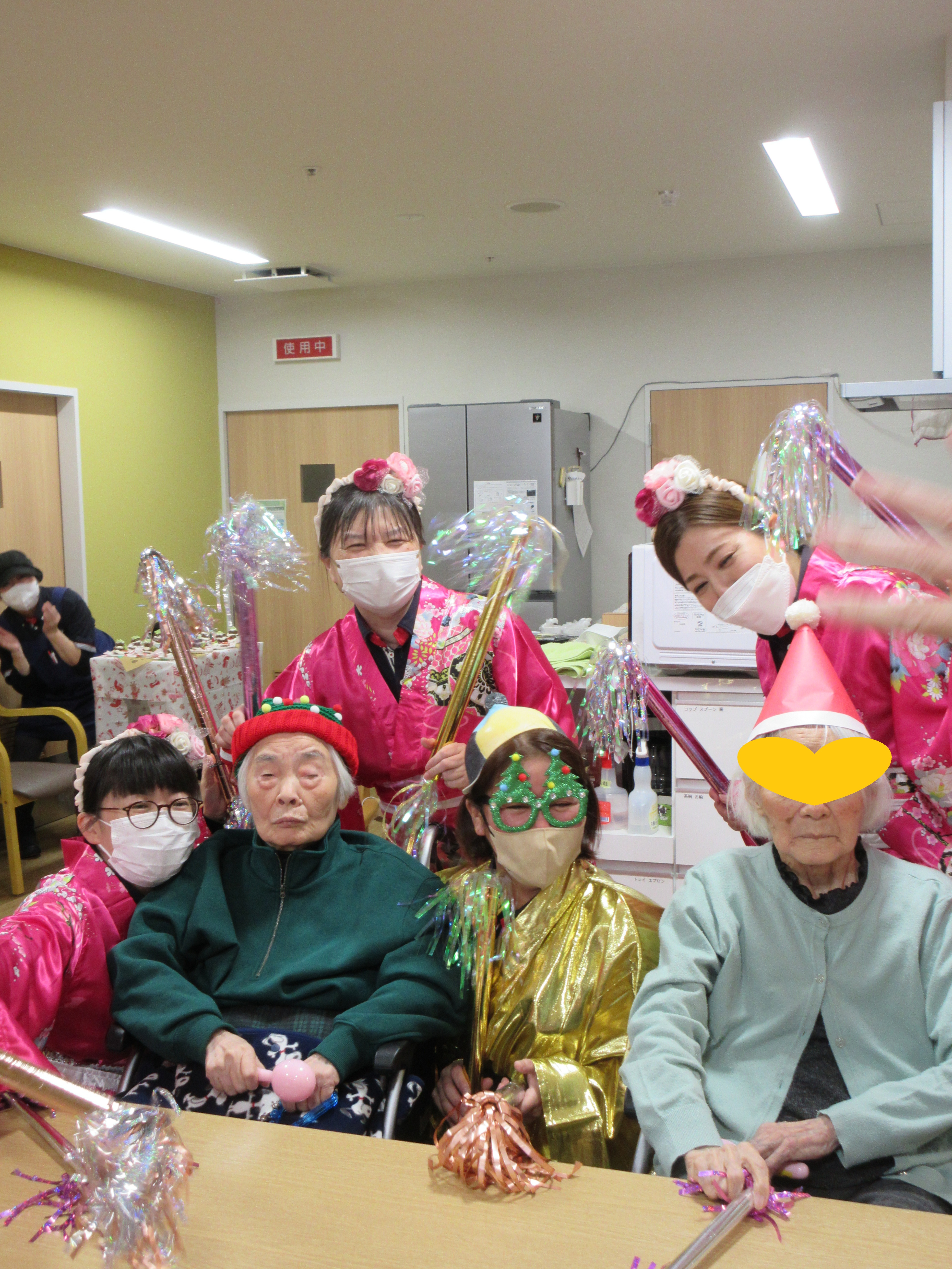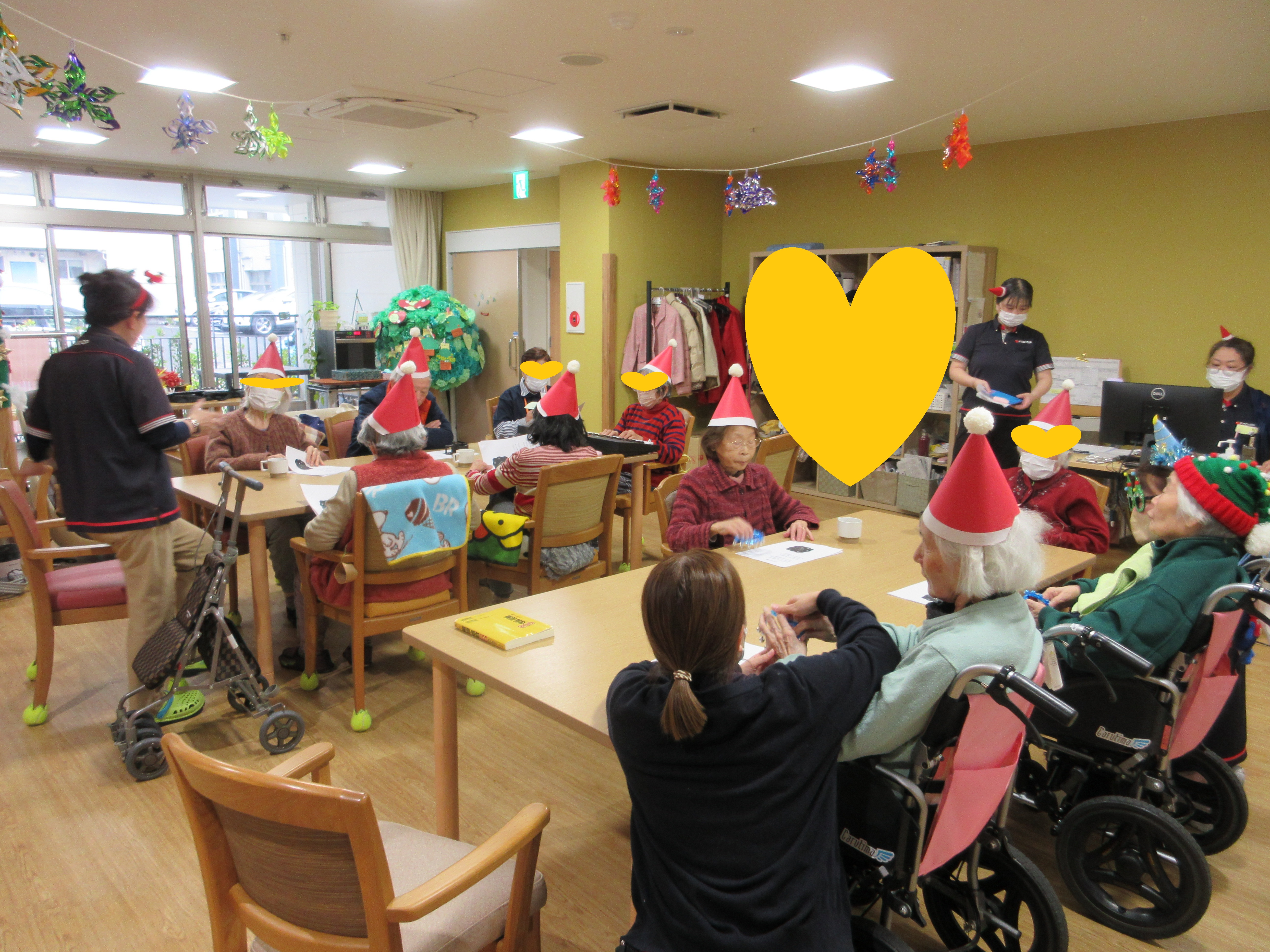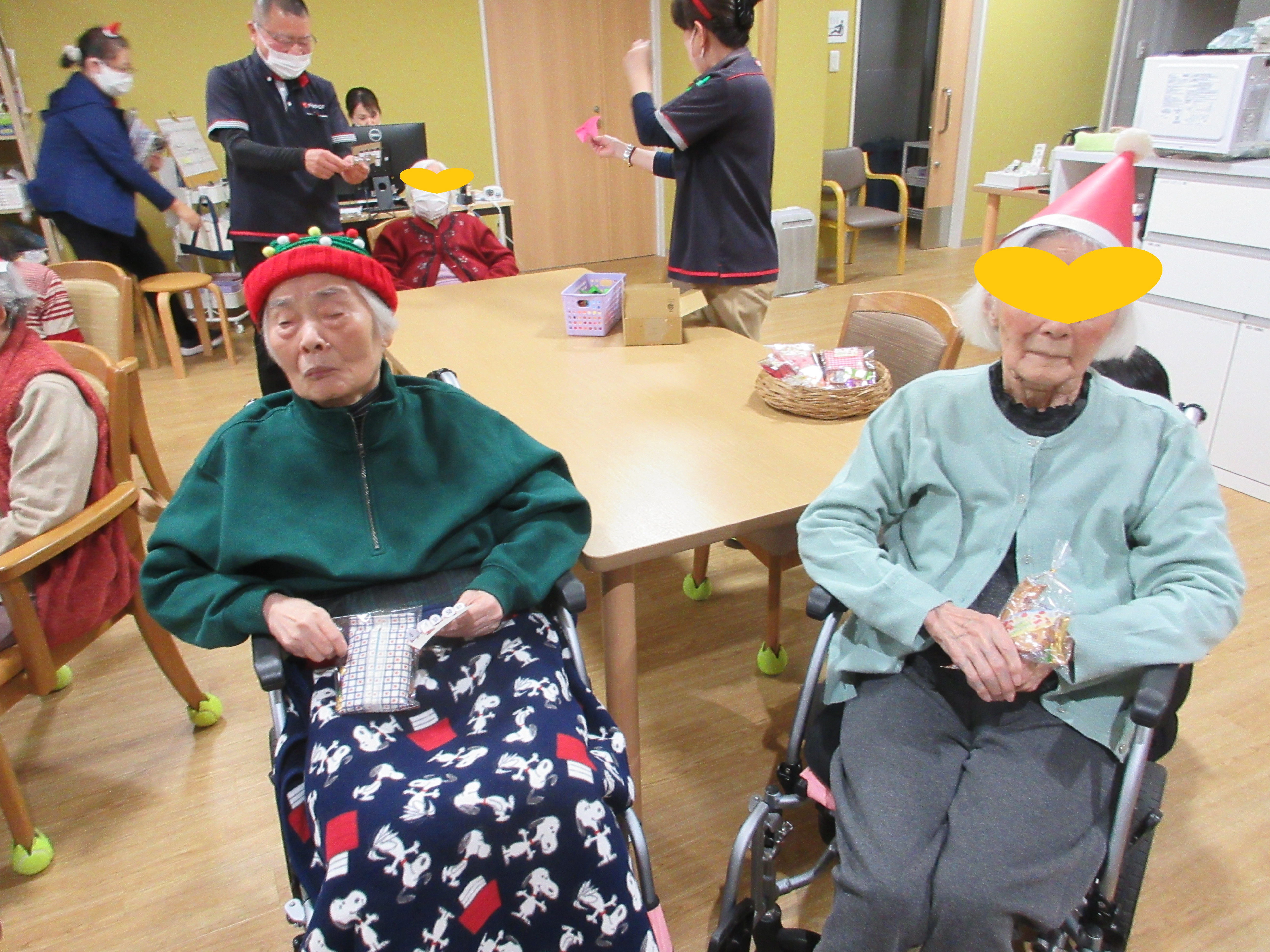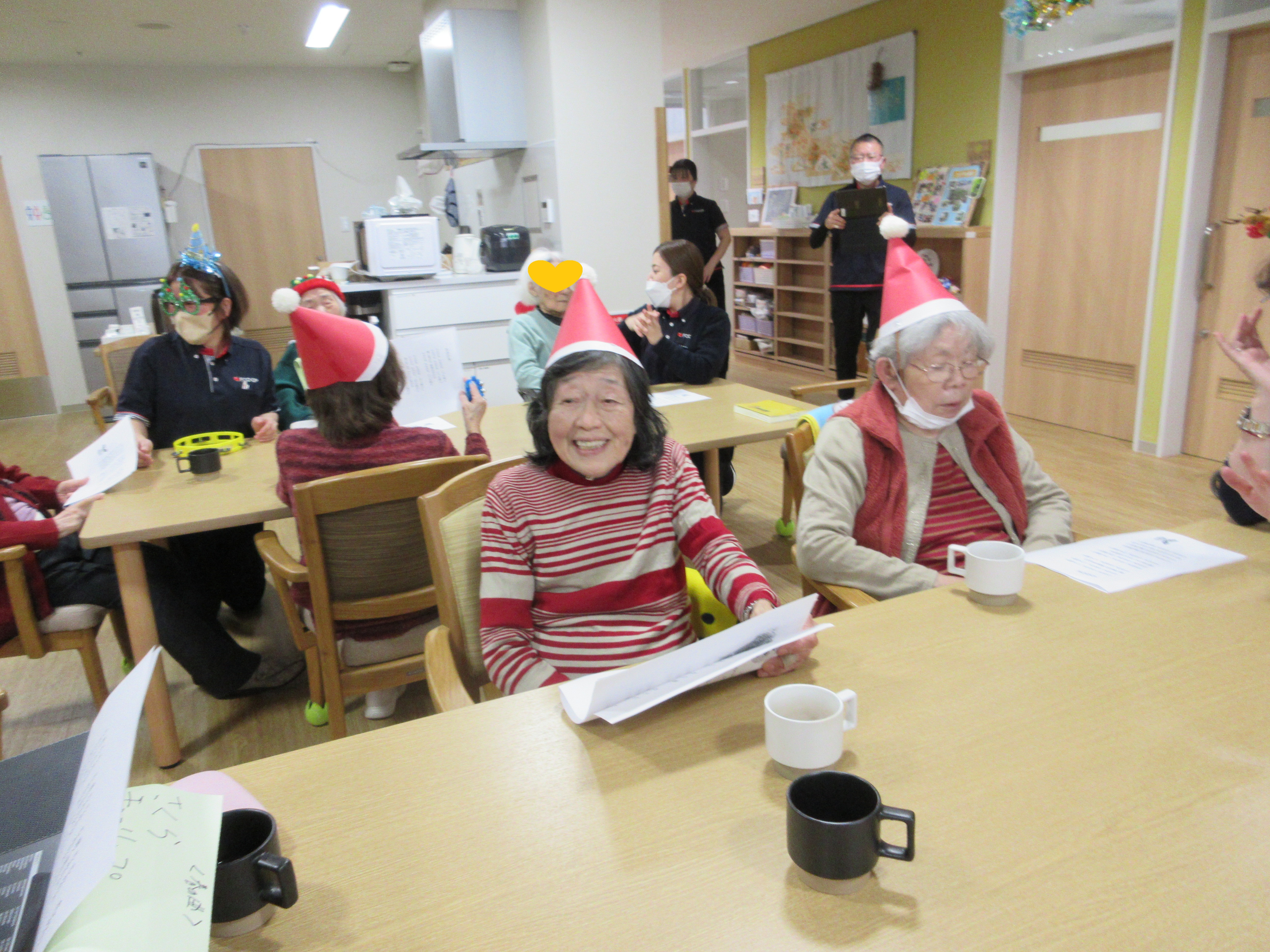 ご自宅からクリスマスのコスチュームを身に着けて来所して下さる利用者様もおられ、イベントを盛り上げて下さいました!サンタ帽を付ける時に初めは「恥ずかしい」と言われていた利用者様も、みんなで付けてお互いに顔を合わせると「かわいかね~」とニッコリと笑顔でした。