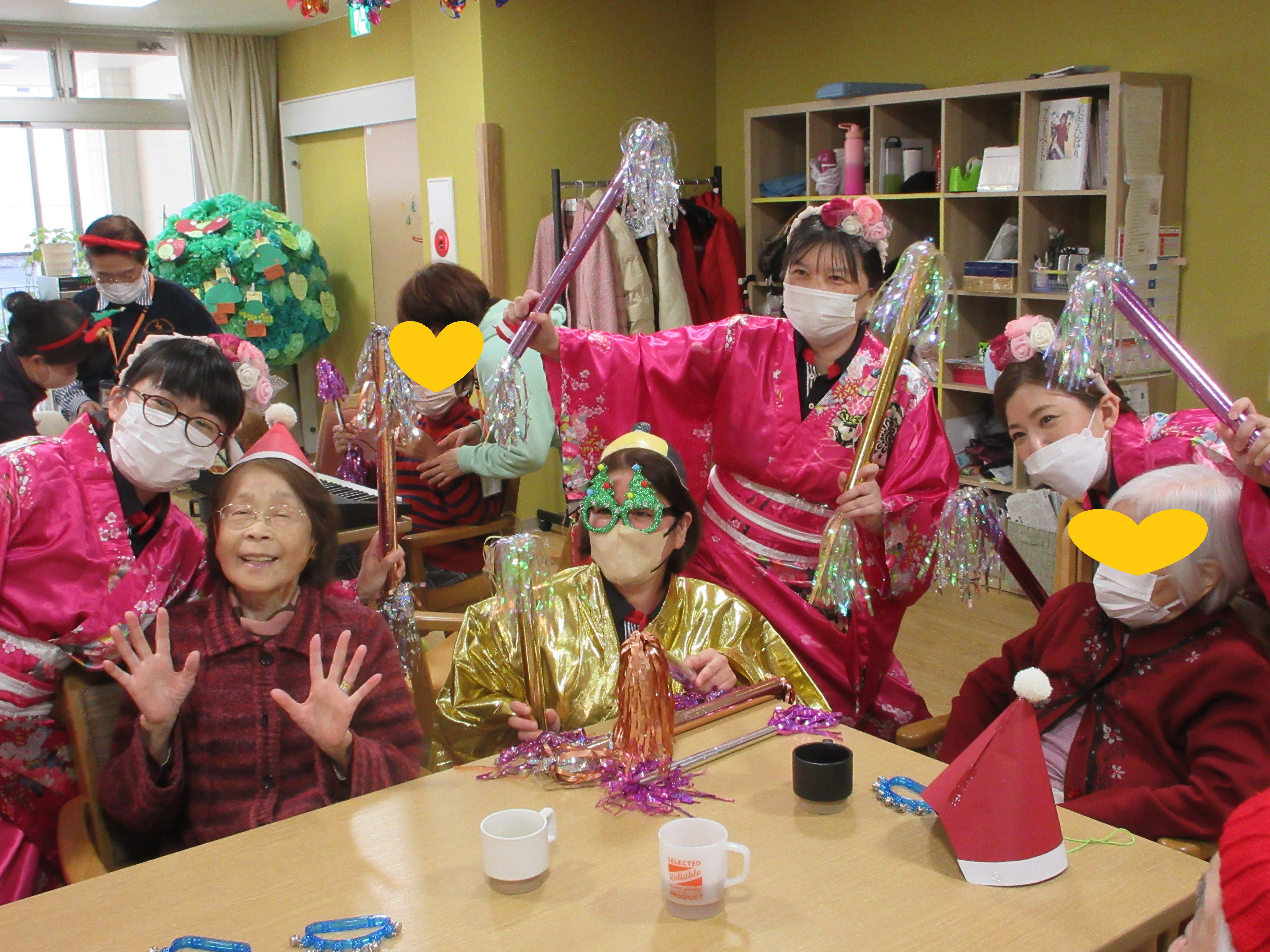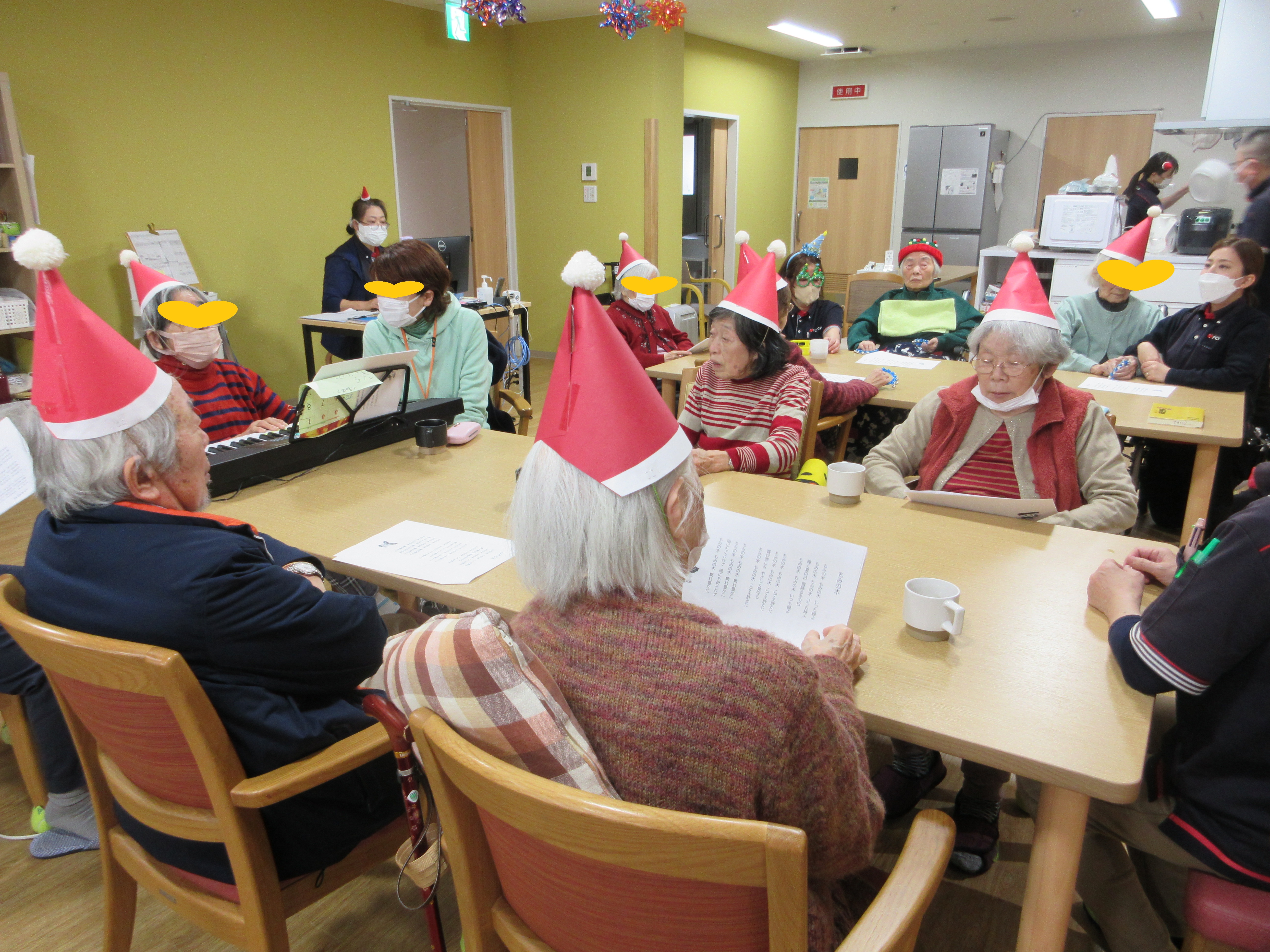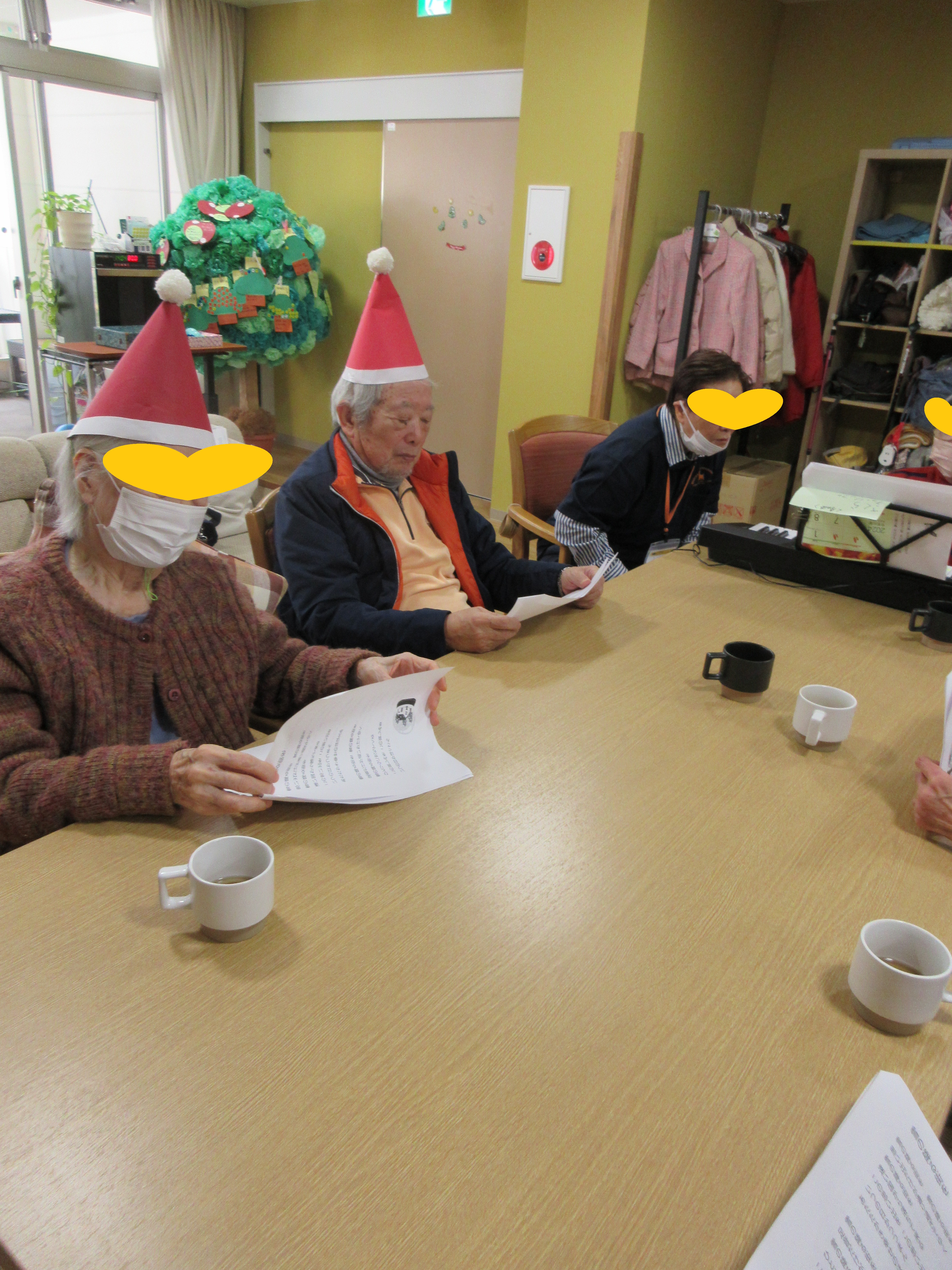 ご自宅からクリスマスのコスチュームを身に着けて来所して下さる利用者様もおられ、イベントを盛り上げて下さいました!サンタ帽を付ける時に初めは「恥ずかしい」と言われていた利用者様も、みんなで付けてお互いに顔を合わせると「かわいかね~」とニッコリと笑顔でした。