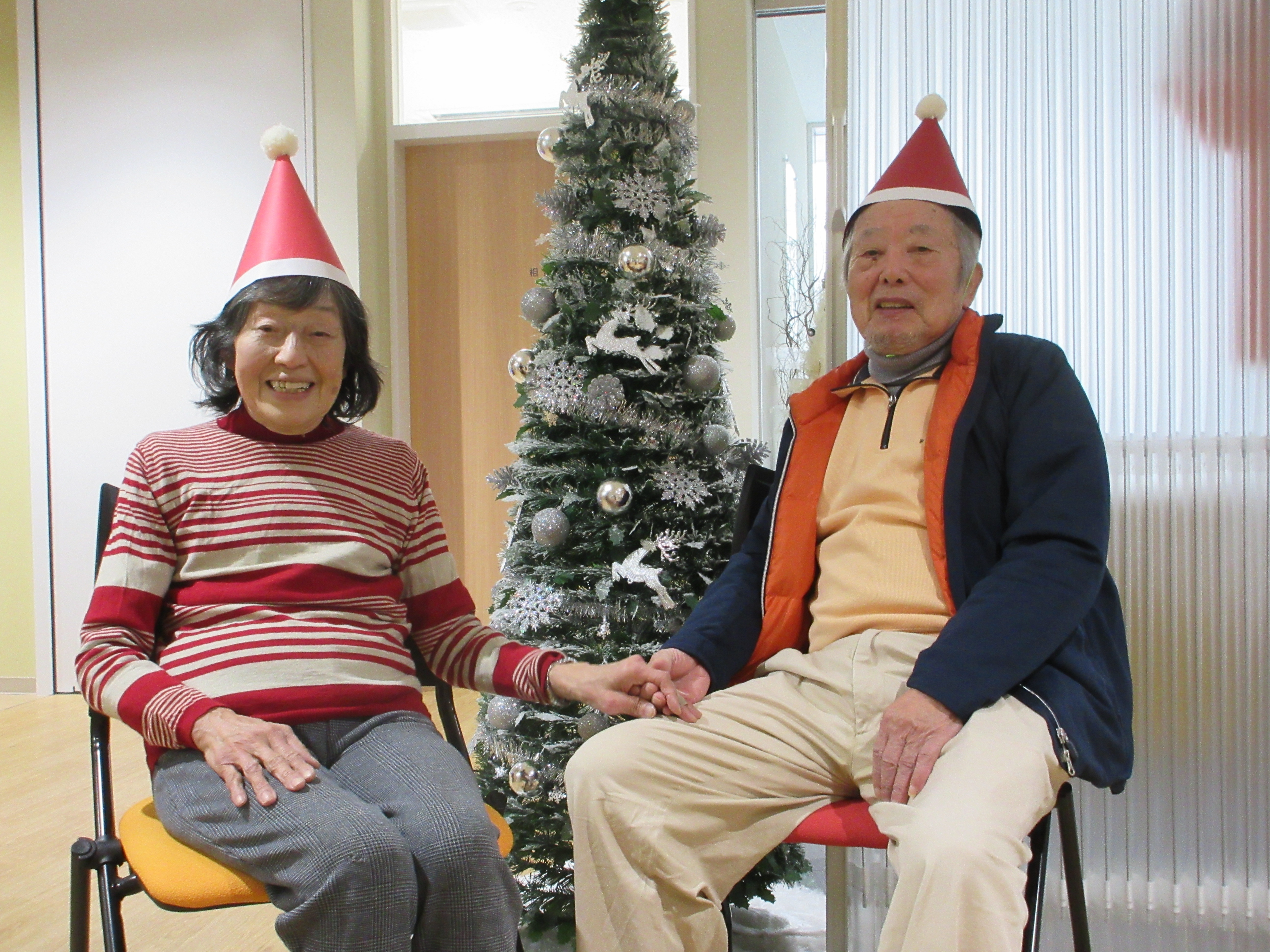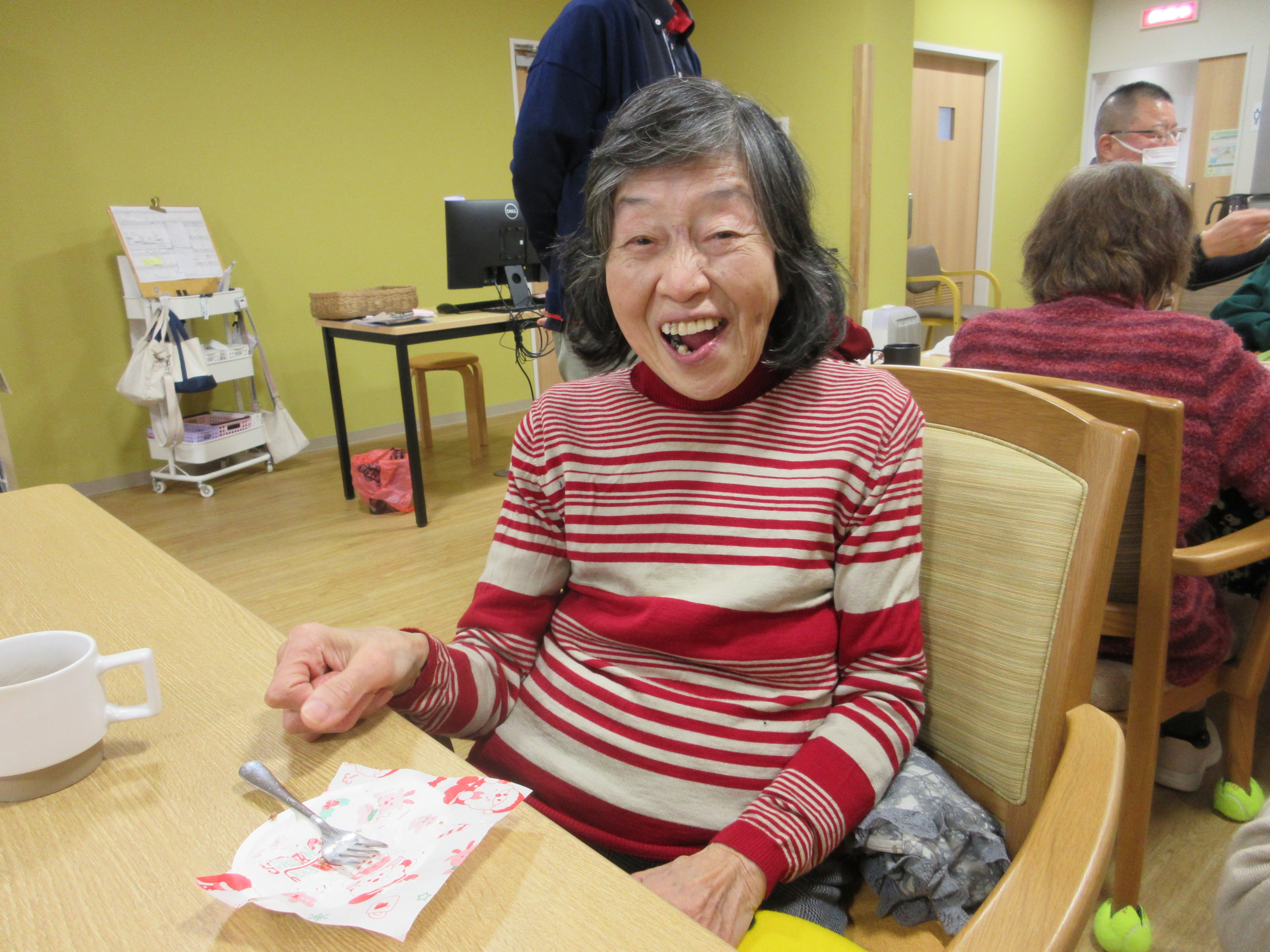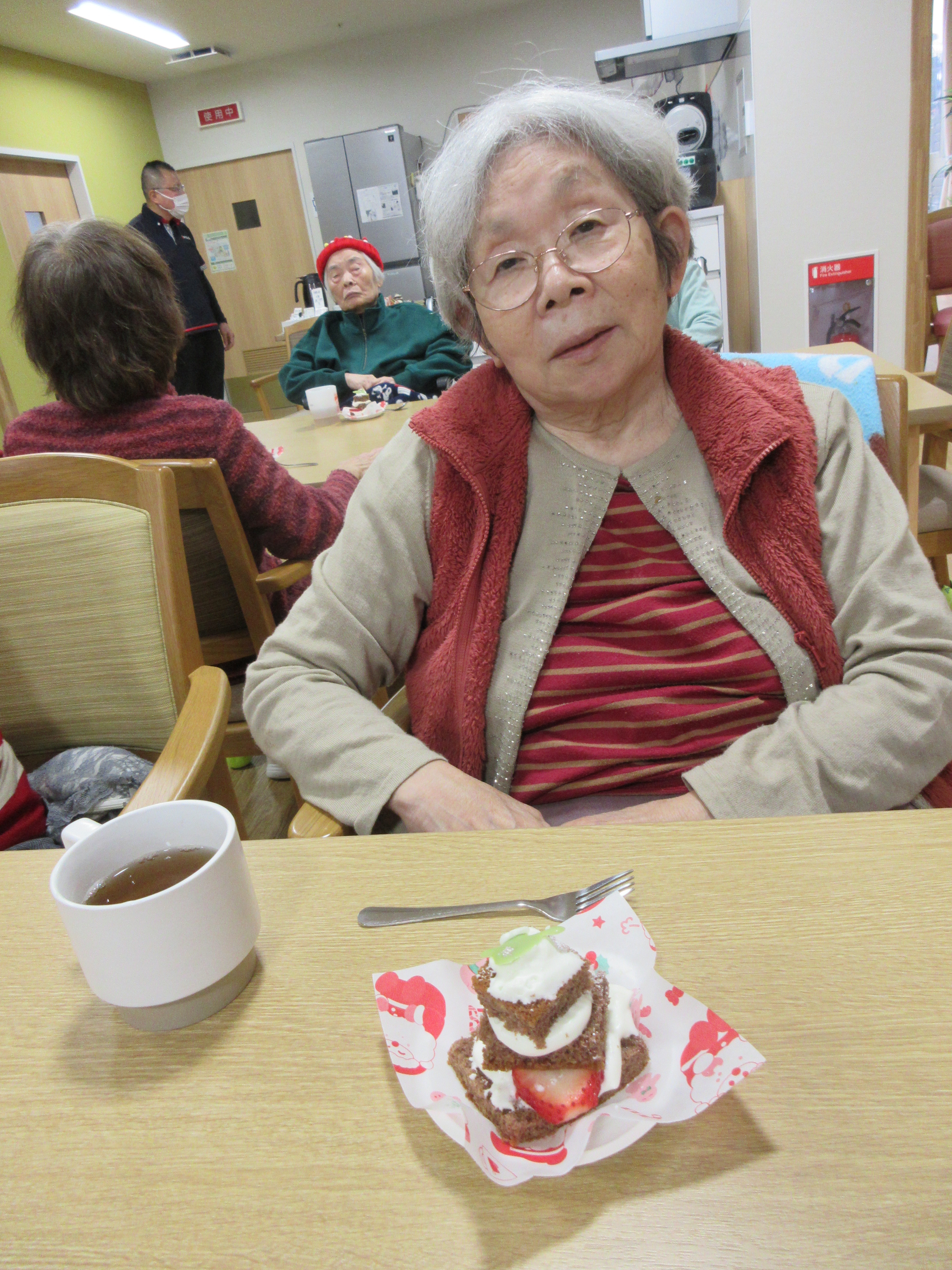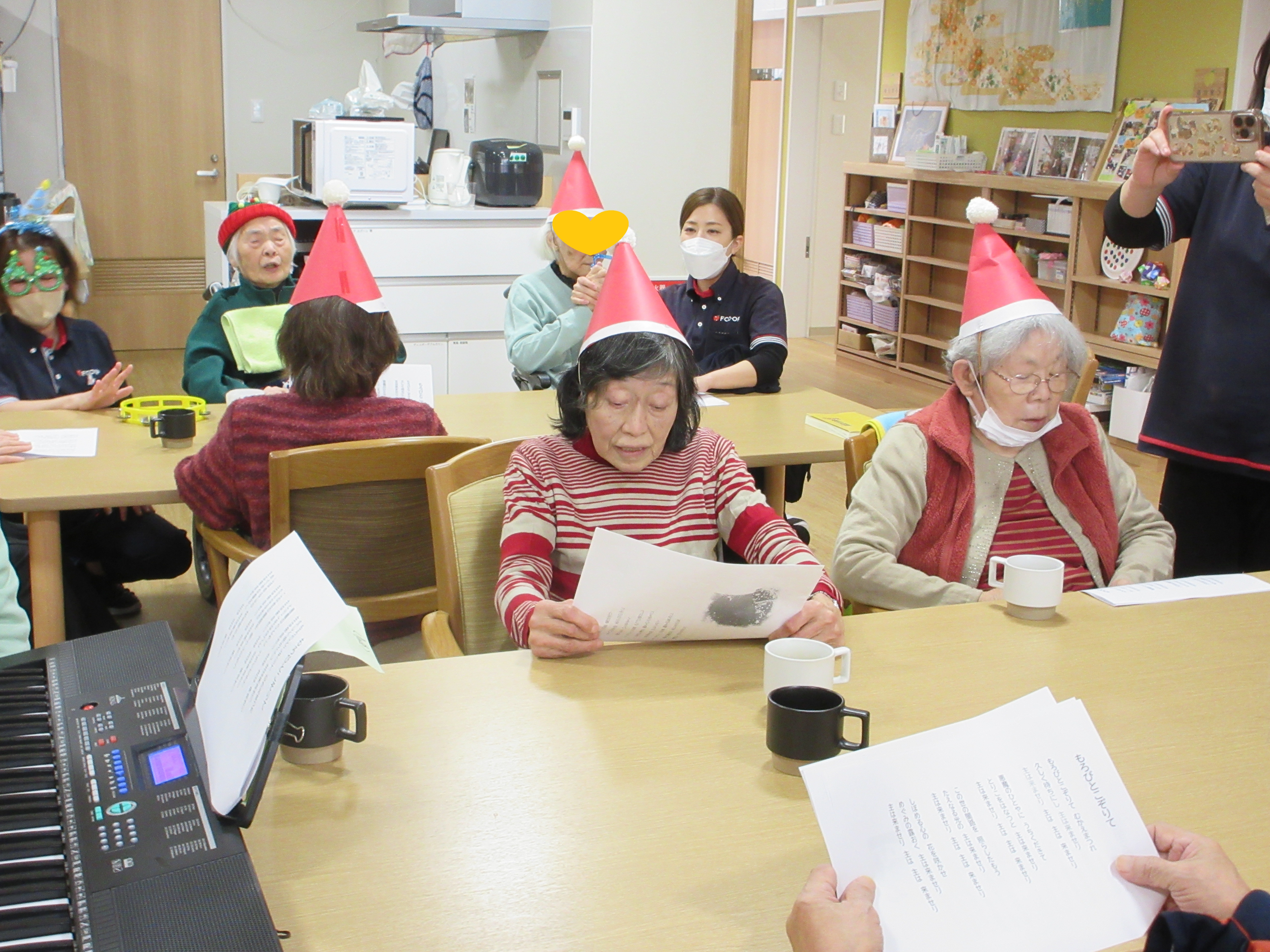 ご自宅からクリスマスのコスチュームを身に着けて来所して下さる利用者様もおられ、イベントを盛り上げて下さいました!サンタ帽を付ける時に初めは「恥ずかしい」と言われていた利用者様も、みんなで付けてお互いに顔を合わせると「かわいかね~」とニッコリと笑顔でした。