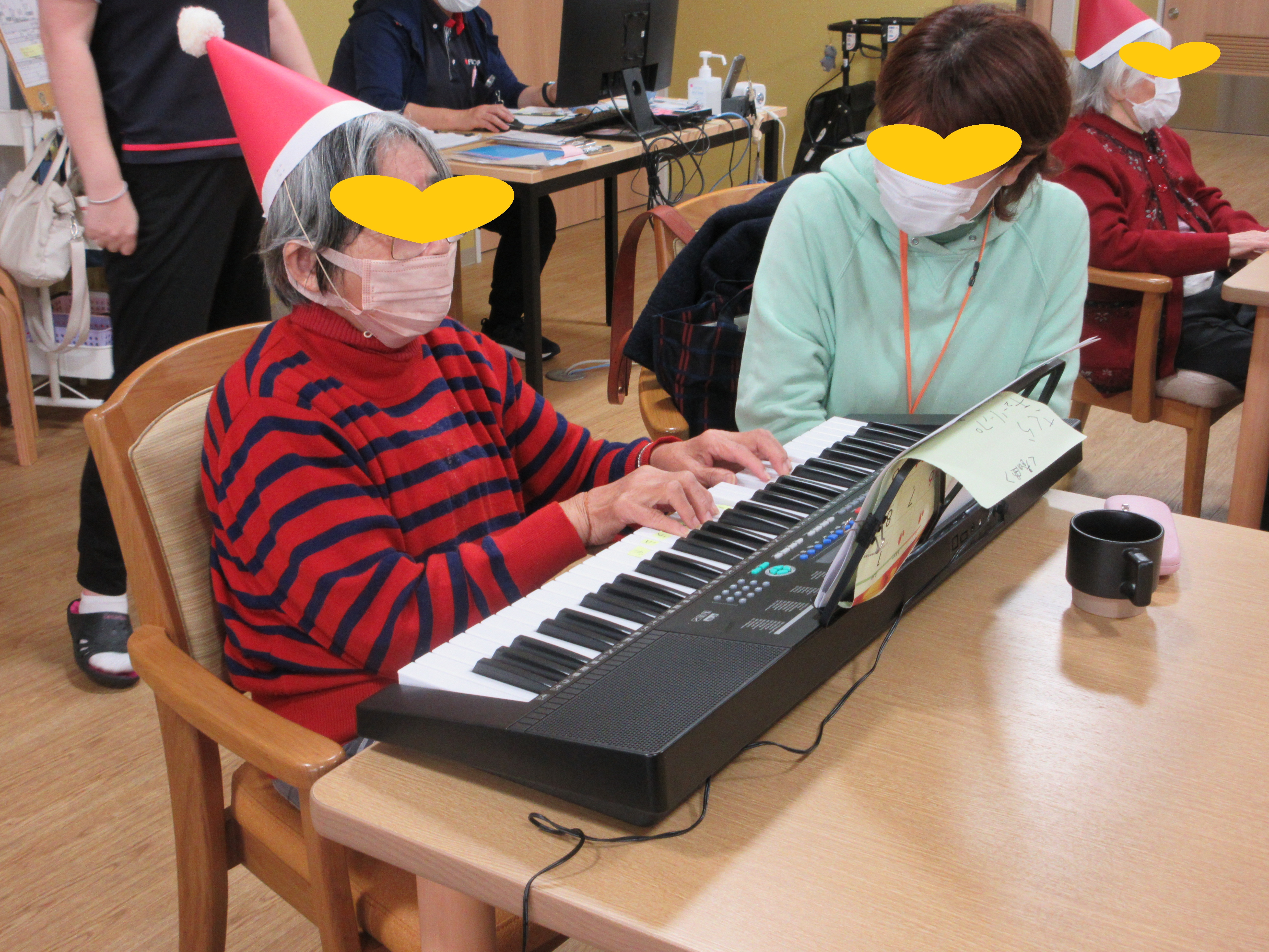 その後は、楽しみにしていた“かがやき音楽隊”の演奏会です。ある日「みんなで楽器演奏とかしたら楽しそうだね」と言う提案から、みんなで演奏会をすることになり、11月頃から練習を重ねてきました!ピアノの得意な利用者様を中心に、スタッフと利用者さまとでピアノ、木琴、ピアニカ、リコーダー、カスタネット、ギター、タンバリン、マリンバなどたくさんの楽器を使用して練習を重ねてきました。本番ではきらきら星と、ジングルベルを演奏して大成功の演奏会になりました~!