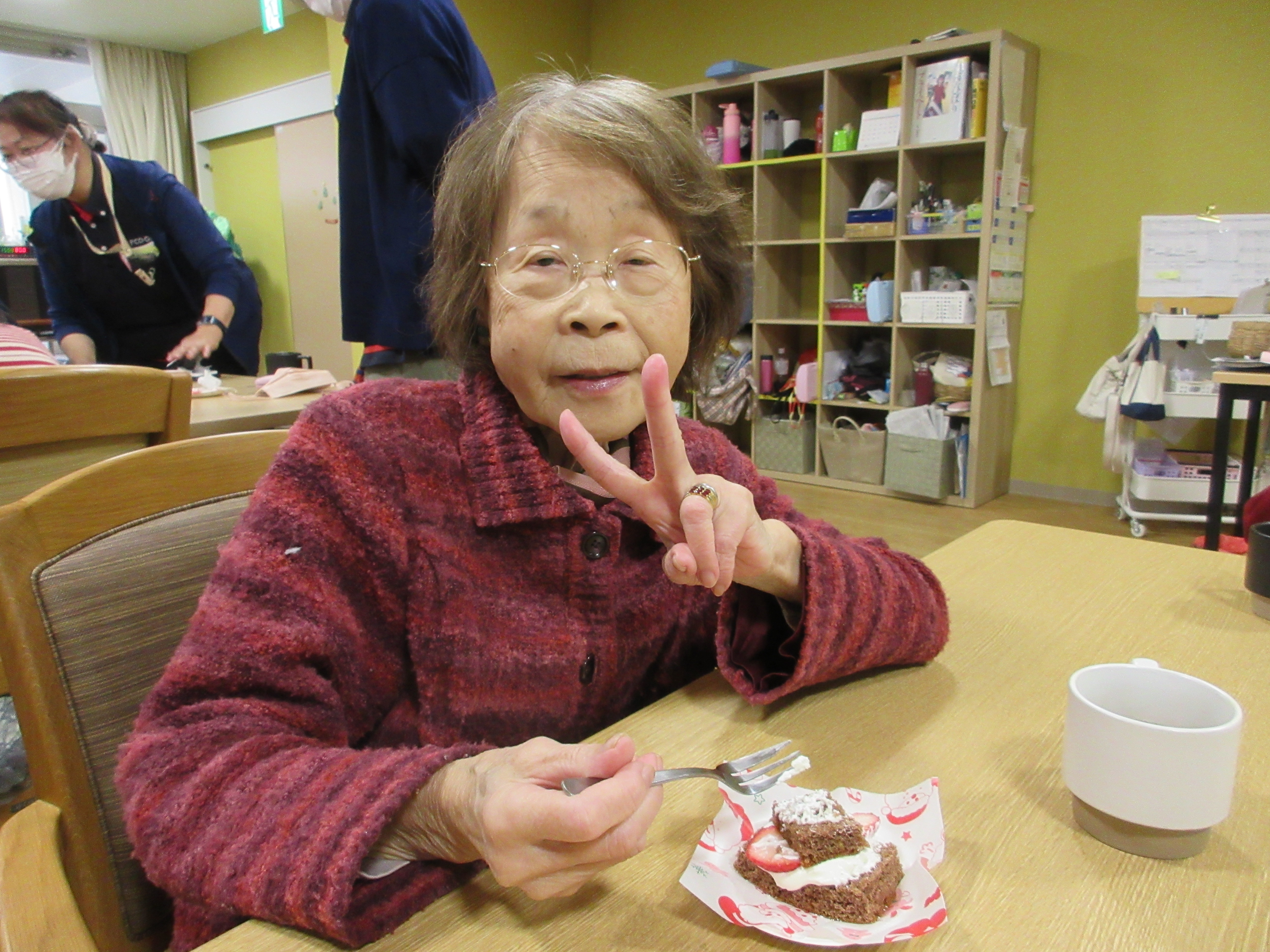 クリスマス会のビックイベントは、ビンゴ大会です。ビンゴではスタッフと一緒に数字を確認し「ビンゴ~!」と元気よく声を上げてくださりました!景品を選ぶ際には「どれにしようかね~」と楽しそうに、選んでありました。いくつになってもプレゼントは嬉しいものですね!
