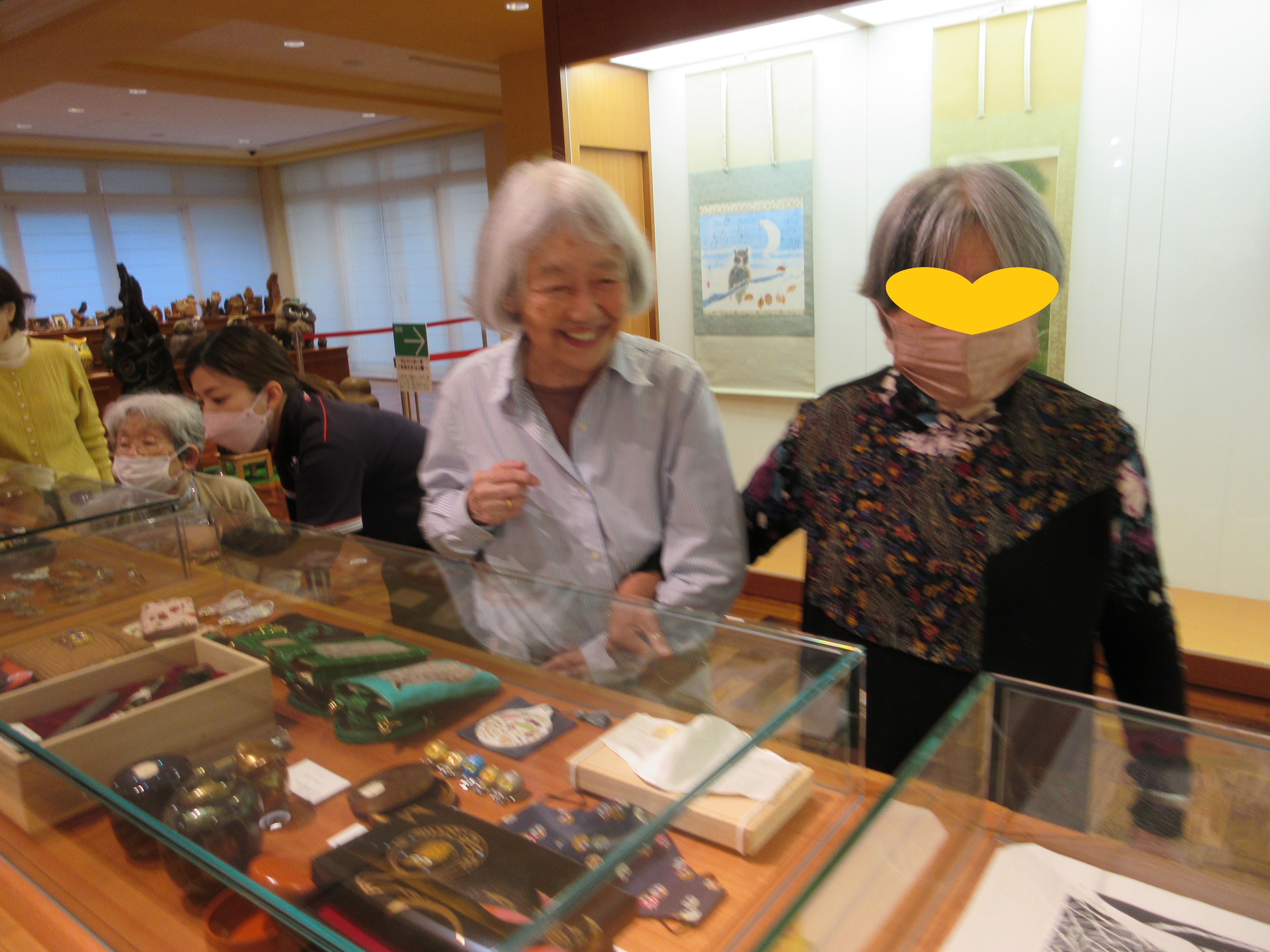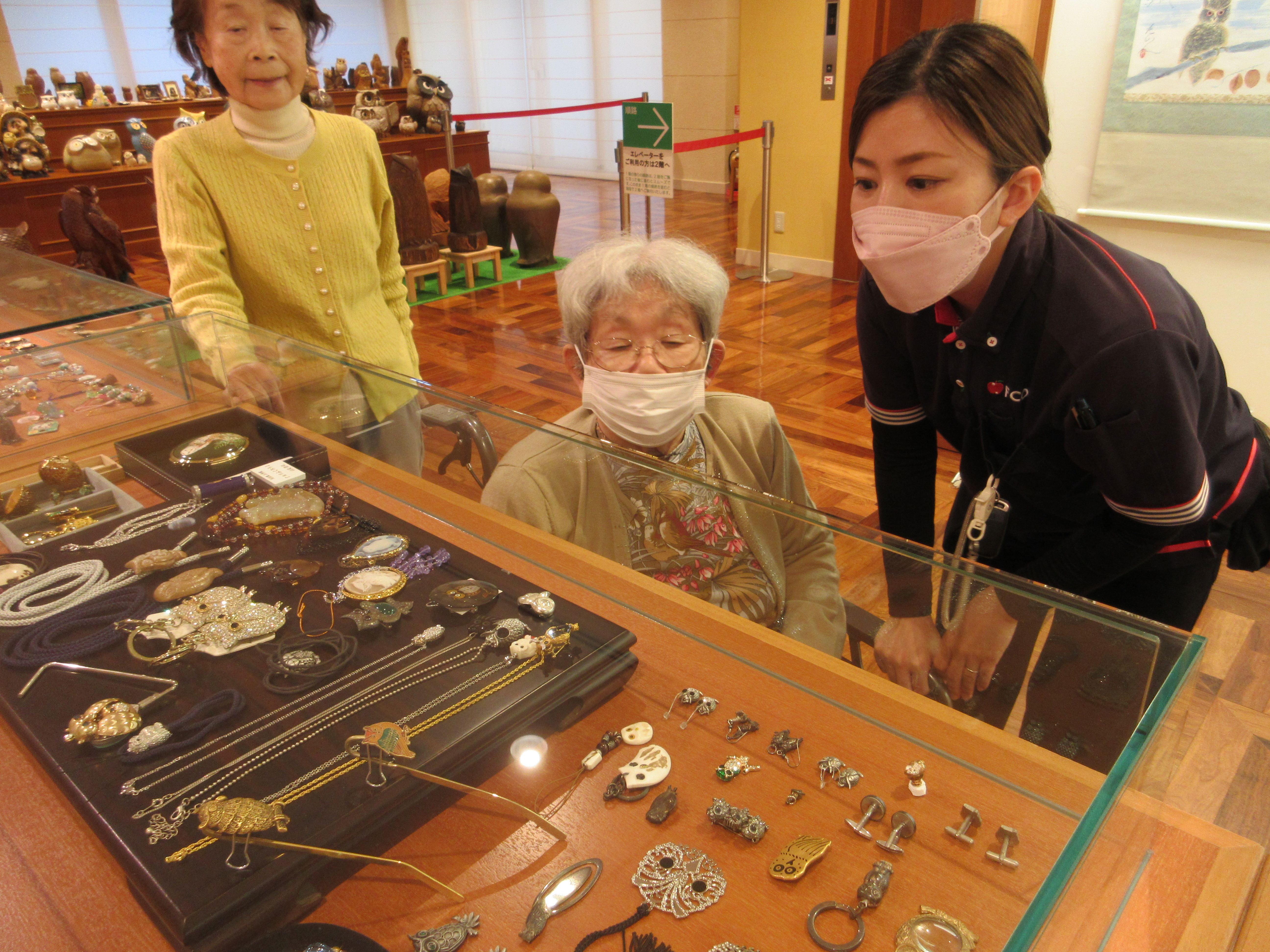 沢山のフクロウ作品に「うわぁ~これもフクロウなの😯」「ちょっと、ちょっとコレ見て!」「可愛いわね❤️」