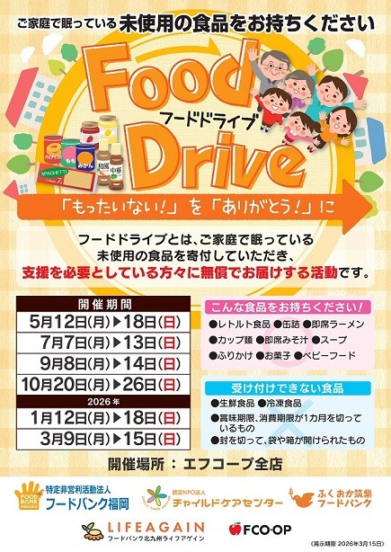 「フードドライブ」とは、家庭に眠っているまだ食べられる食品を持ち寄り、地域の福祉団体や施設、フードバンク団体などに寄贈することで、必要としている人に使ってもらうためのとりくみです。エフコープでは各店舗や事業所でフードドライブを実施し、開催期間中に寄付いただいた食品を預かり、食品廃棄物削減のとりくみを進めています。