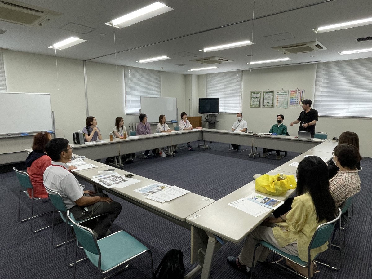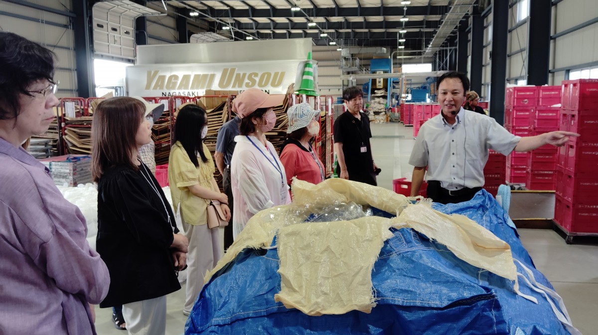 昼食後、エコセンターへ移動し、見学をさせていただきました。鳥栖エコセンターでは、私たちが日ごろ利用し返却しているカタログ・チラシ、飲料パック、卵パック、収集袋などが、どのようにリサイクルされるのかについて学ぶことができました。具体的には、収集された資材の重量を測定し、不純物を取り除いた後、圧縮処理を経て出荷される過程を拝見しました。また、事業活動においては、SDGsの理念に基づき、日本において19位の貢献を果たしていることも理解しました。