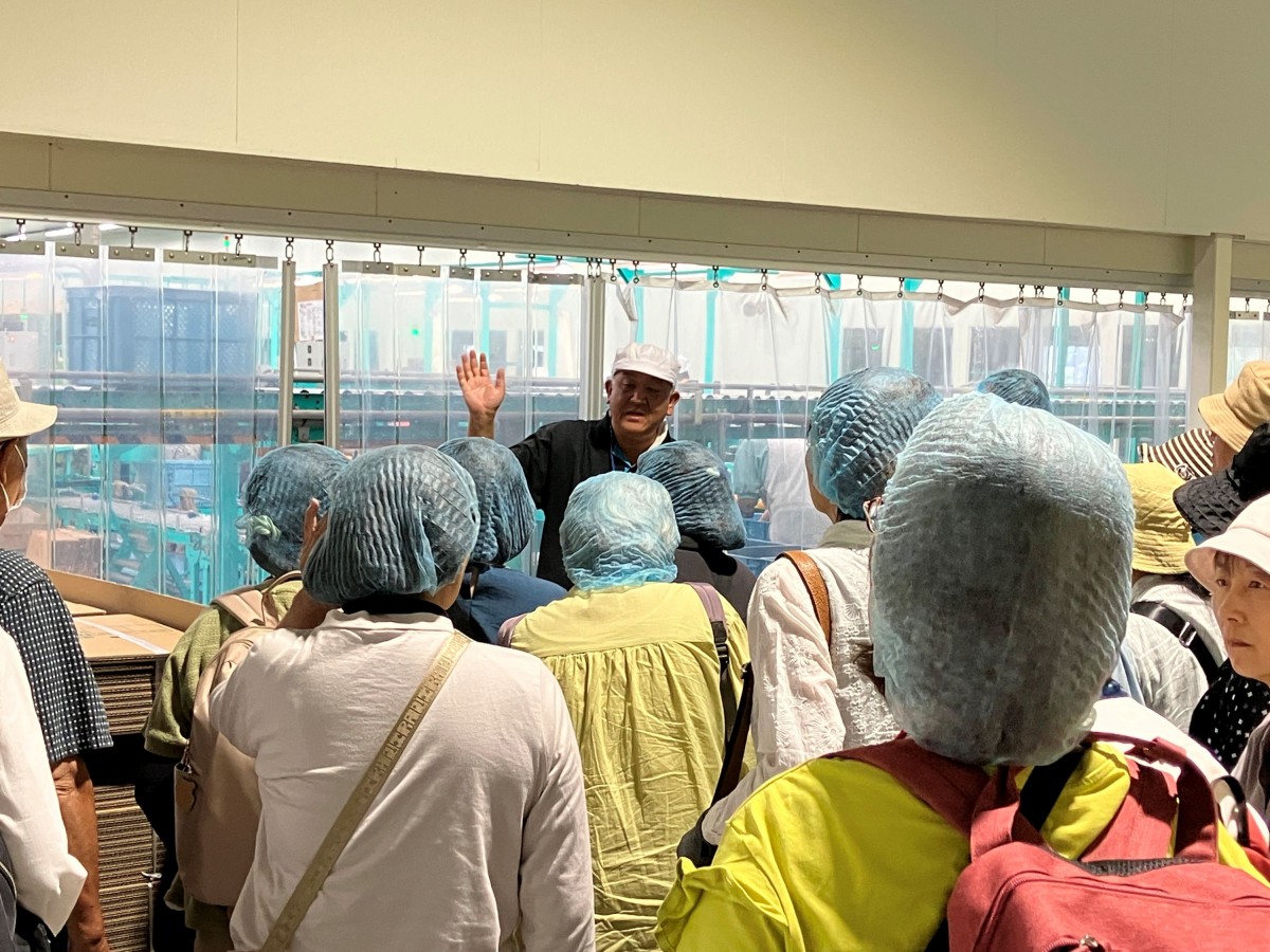 午後からは婦人部の方々からの歓迎を受け、採れたての『とよみつひめ』や生ハムまき、スムージーを試食しました。交流会では、グループごとに直に生産者の生の声を聞かせていただきましたが、どのグループもお話が尽きないほど盛り上がりました。雨が降り過ぎるとどろっとした実になり、日照りばかり続くと実が硬くなるため、非常に天候に左右される繊細な果実とのことでした。また早朝3時から5時の間に収穫するため、後継者不足の問題も抱えていらっしゃるそうです。生産者の生の声を聞くことで、親近感が湧き共感できることも多く、おいしくいただけることに感謝しながら、これからも応援していきたいと思いました。
