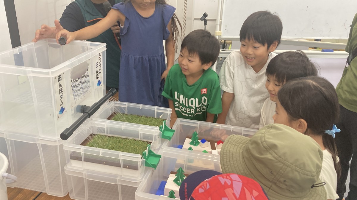 その後、くるめウス館内で「田んぼダム」の仕組みと効果について実演を交えて学びました。「田んぼダム」は調整板などの簡単な器具を水田の排水口にとりつけることで、大雨時に雨水を一時的に貯留し、排水量を抑えて周辺の農地・集落の浸水被害を軽減できる仕組みで、多大な費用と時間をかけて大規模な施設を造成する必要がなく、安価ですぐに効果が発揮できることを知りました。実際に模型を使っての「田んぼダム」の説明は子どもたちにもわかりやすく学ぶことができたようです。