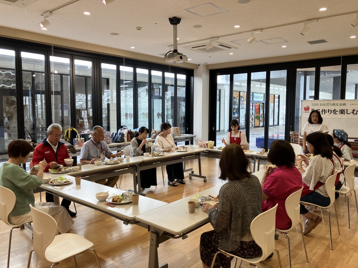 前半は、すやまよしこさんに新聞ばっぐ作りの指導をしてもらい中ばっぐを作りました。後半は、コープのミールキット(葉野菜を加える海鮮八宝菜・たらと野菜の甘酢あん)や、緑黄色野菜とおからのハンバーグ、フリーズドライのスープ(揚げ茄子と生姜のスープ・1食分の野菜ちゃんぽんスープなど)を試食しながら交流しました。