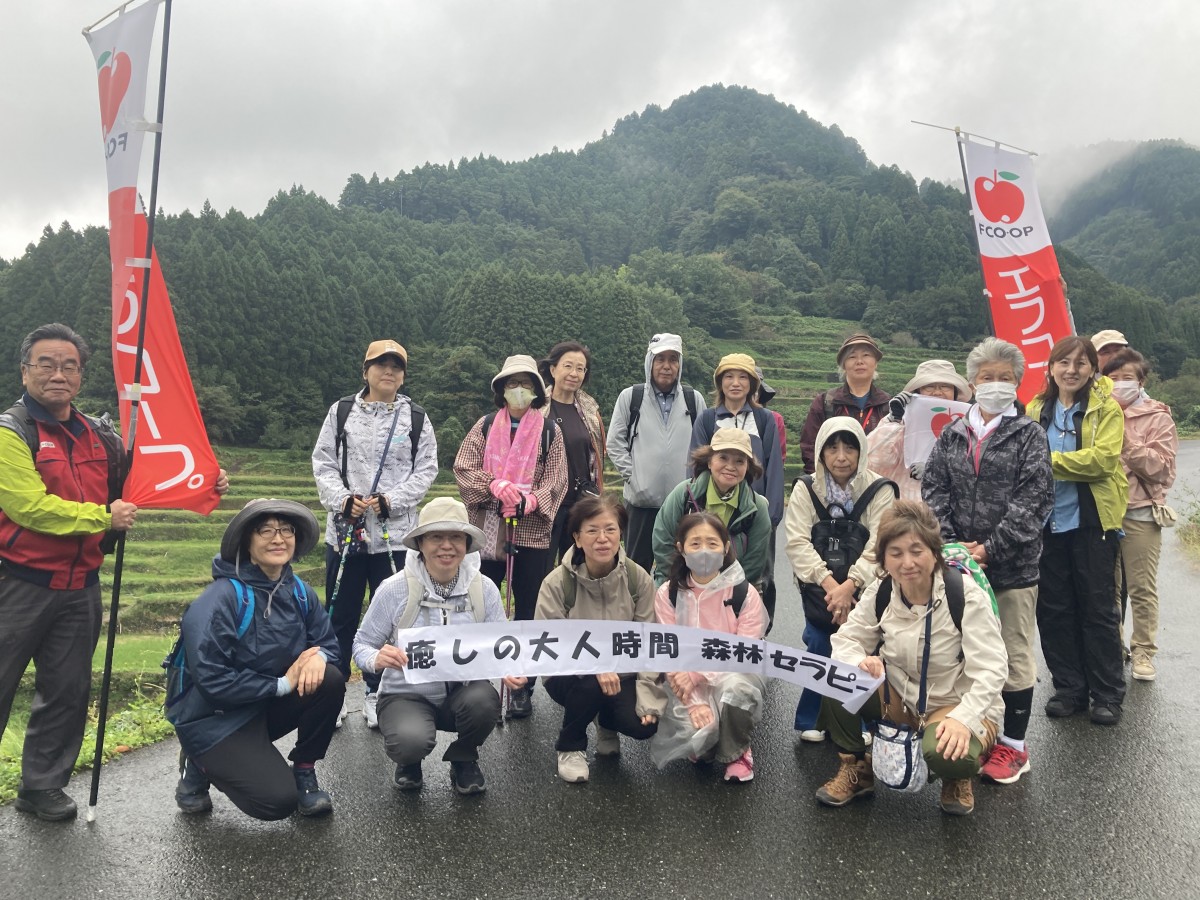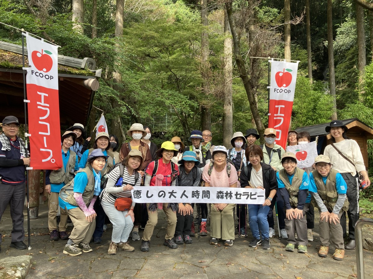 エフコープと包括連携協定を結んでいる「うきは市」にて、森林セラピーを2日間にわたりそれぞれの場所で開催しました。10月16日調音の滝コースは、参加者22名(スタッフ含む)、10月22日つづら棚田コースは、参加者21名(スタッフ含む)でした。