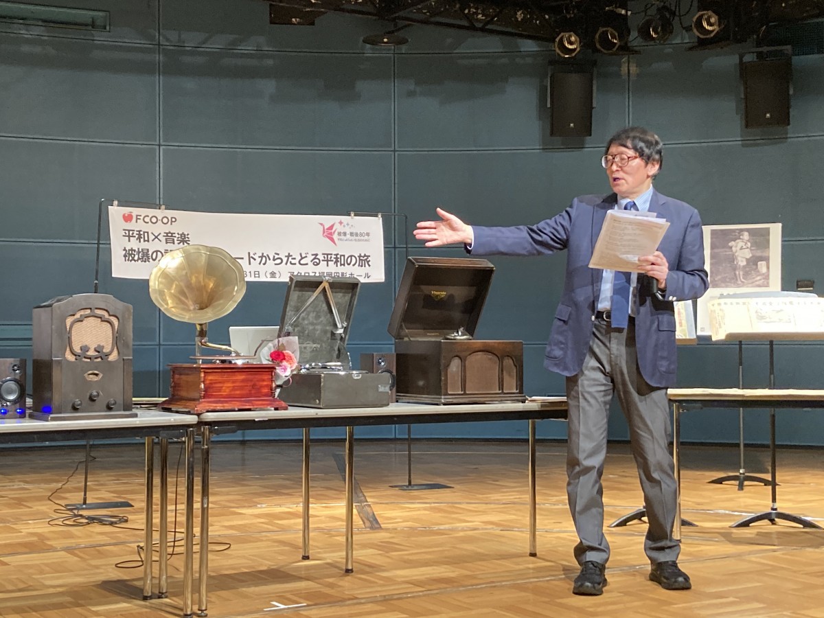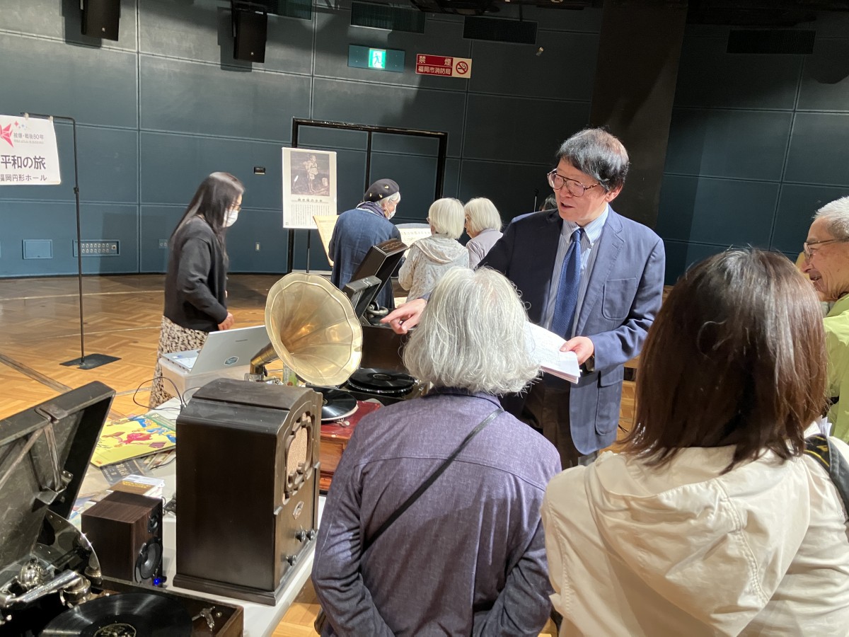 第1部は「軍歌や戦時中の流行歌から考える平和」をテーマに、蓄音機や、当時のレコード収集が趣味のスタッフが戦時歌謡ガイドとして講演しました。