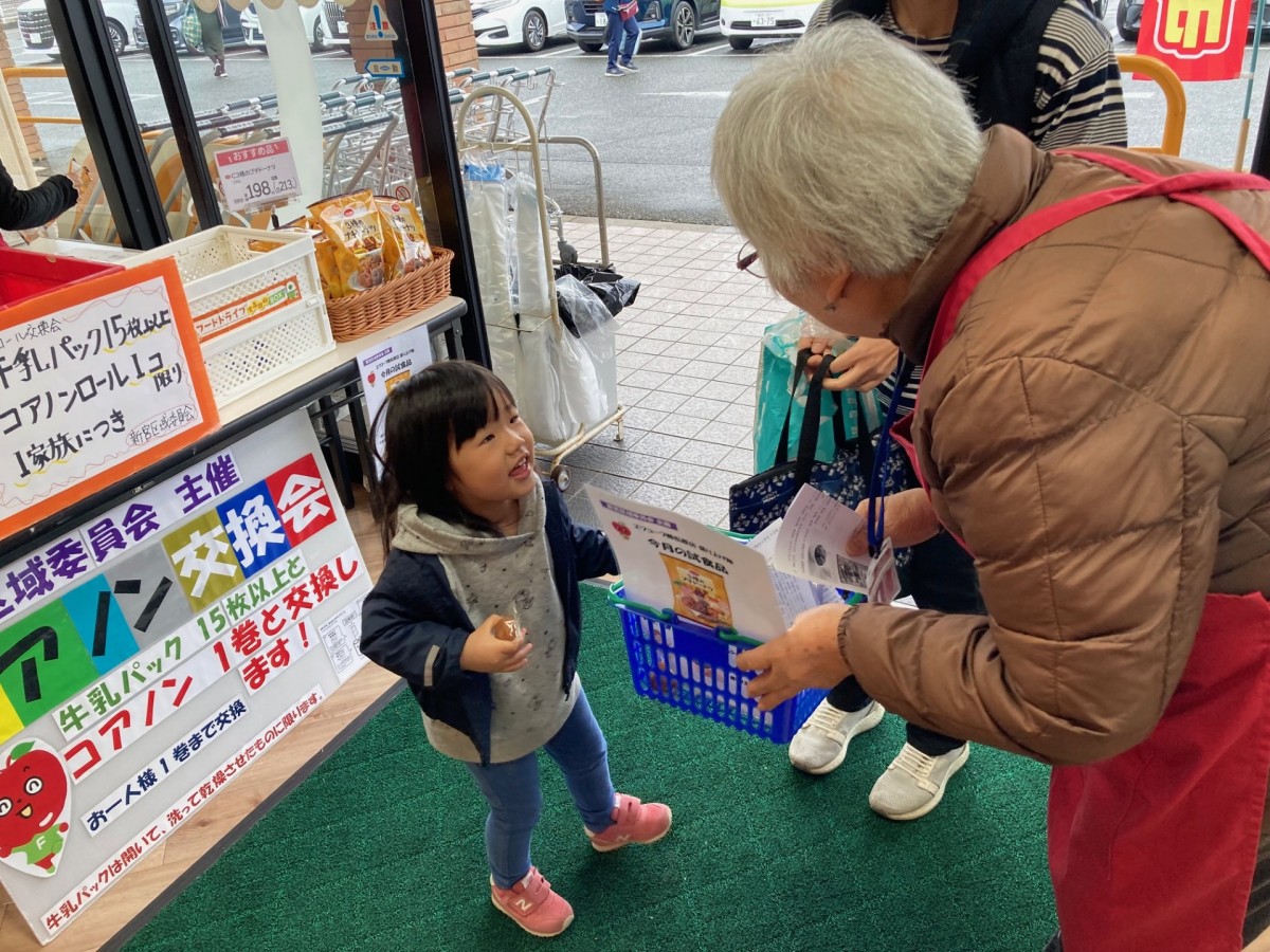 11月25日(火)、新宮区域委員会による組合員活動として毎月開催している「舞松原店盛上げ隊」(通称、舞盛り)での、コアノン交換会(牛乳パック15枚以上でコアノン1ロールと交換)を行いました。当日は少し肌寒く感じ、途中で雨が降り出す悪天候でしたが、区域委員3名の参加をいただき、コアノン交換会には、72名の組合員が交換にいらっしゃいました。今回もコアノン交換会に参加いただいた方と、来店された方に試食として『C3種のプチドーナツ』を132名の方にお渡ししました。店舗の入り口や店内でもサンプルをお渡しして、みなさん喜んで受け取っていただきました。コアノン交換会では、今回から改めて「1家族1ロールまで」とのルールを徹底してた交換会を行いましたが、大きな混乱はありませんでした。
