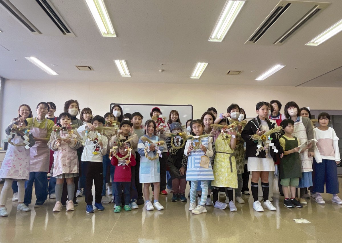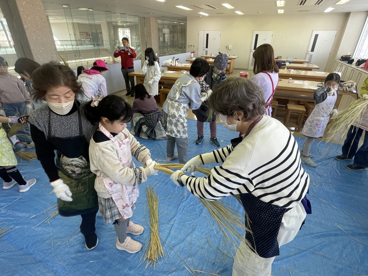 参加人数33名。親子、おばあちゃんとお孫さん、お友達とや、お一人での参加などさまざまな参加の形。班分けをし、みなさん最初は緊張されているご様子でしたが、しめ縄を編む工程では、こうかな?こうしたほうがいいね!など、講師の鬼木さんに聞きながら会話が飛び交い一気ににぎやかになりました。力とコツが必要な工程でしたが、みなさんそれぞれすてきな形ができていました。子どもたちにとっては藁から作る作業はとても貴重な体験です。