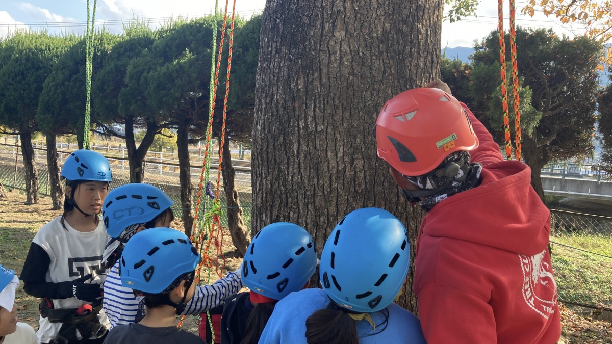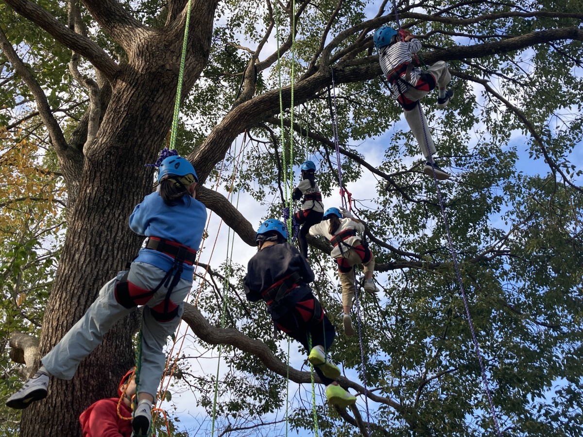 前半のツリークライミングは、専用装備を使って安全に木登りを楽しむアクティビティで、インストラクターの指導のもと木の上での体験を楽しみました。いきいきとしたお子さんたちの表情が印象的で、まさに木とお友達になる体験となりました。