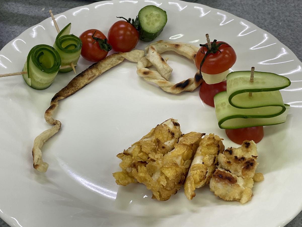 参加者25名で7グループに分かれ、ピザとクリスピーチキンを作りました。ピザは袋の中で粉をまとめ寝かせた後、手のひらで生地を伸ばしました。野菜やチーズなどをトッピングし、オーブンではなくフライパンでピザが焼き上がりました。ピザ生地の半分でグリッシーニも作りました。グリッシーニはイタリア発祥の細長いカリカリパン。スティック状にした後、フライパンで焼きました。細長くねじったり、ハート形や三つ編みなど、各班で個性が出ていました。