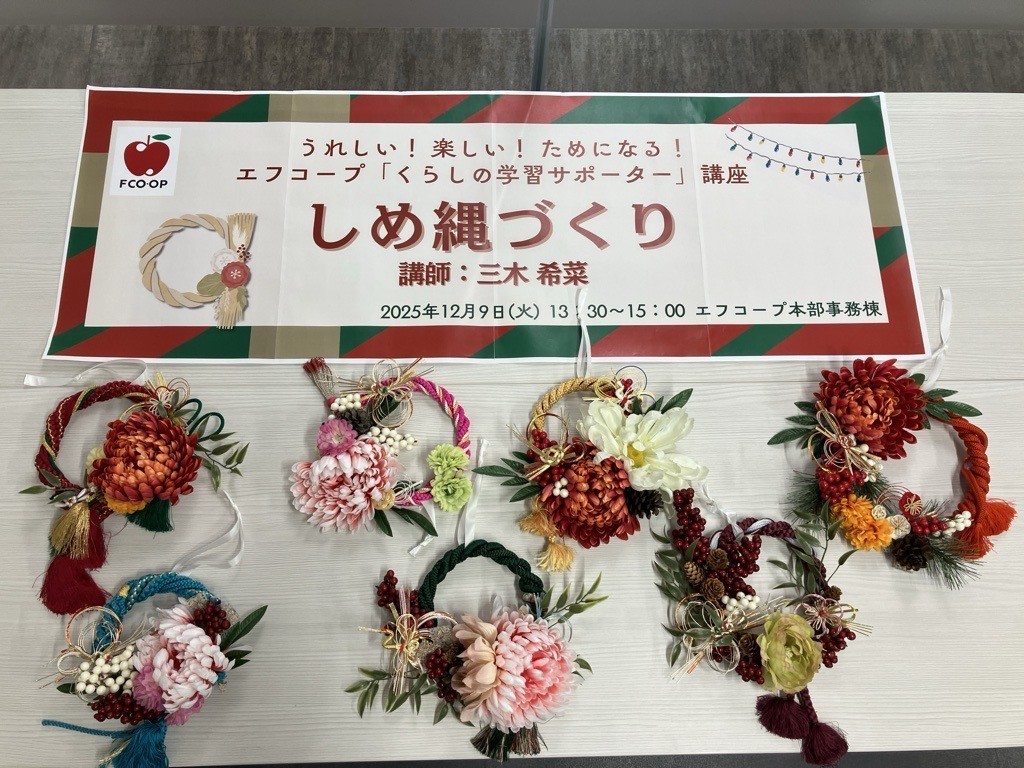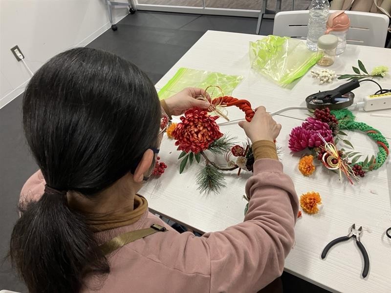 また、午後は「しめ縄づくり」を開催し、8名の参加となりました。今回は初めてしめ縄づくりをする参加者がほとんどで、飾りの配置を悩みながら色鮮やかですてきなしめ縄が完成しました。参加者からは「講師からいろいろな素材やアイデアを教えてもらい、とても満足なしめ縄ができて良かったです」などの声が寄せられました。